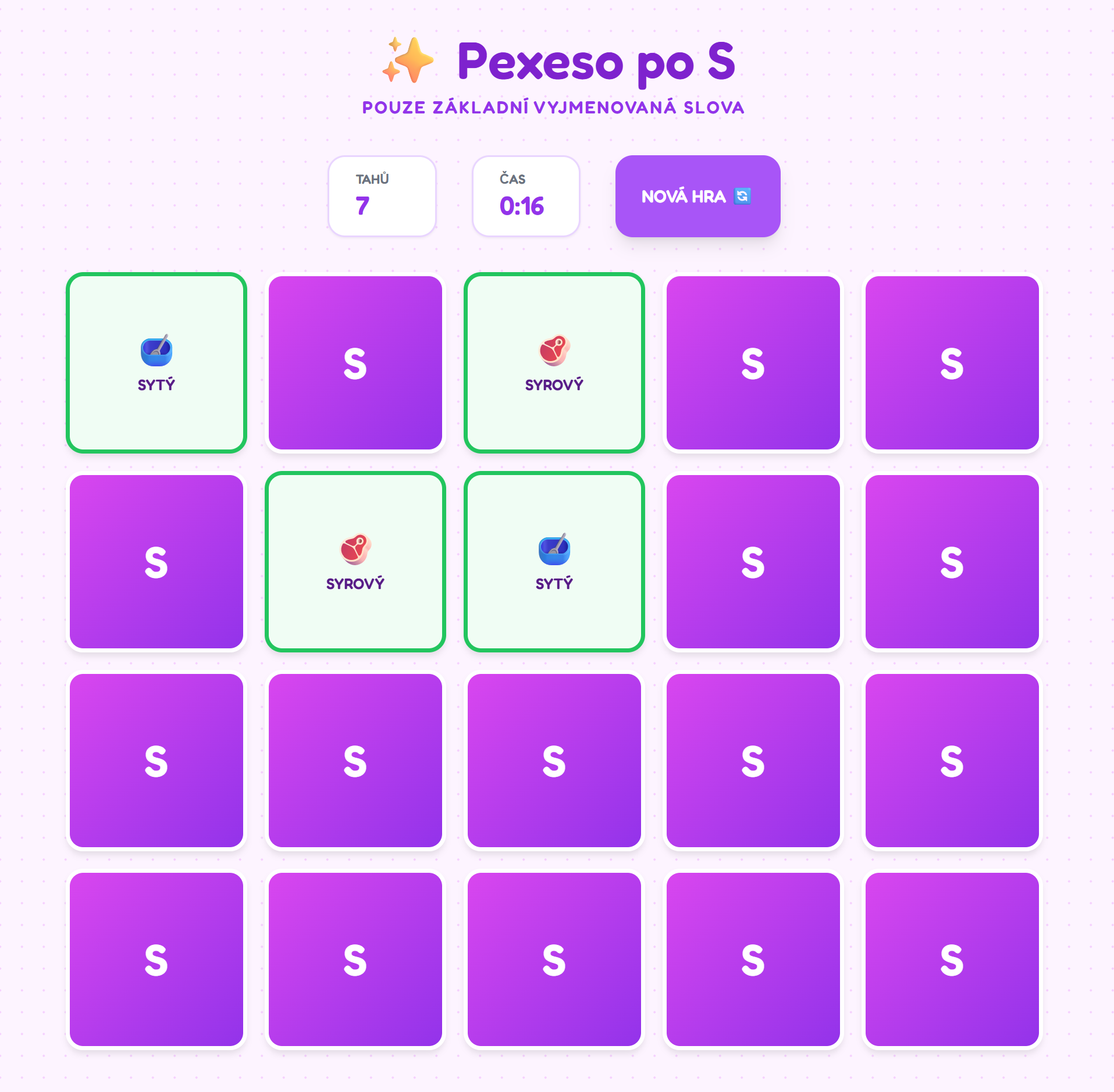 - 10 náhodně losovaných dvojic: Při každém spuštění hra vybere sadu slov (např. syn, sytý, sýr, sychravý, sýkora, sysel atd.), takže každá partie je unikátní.