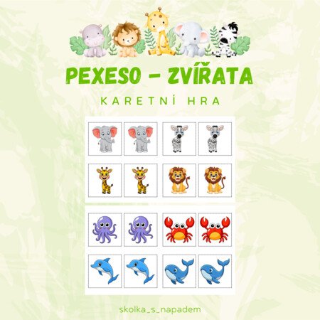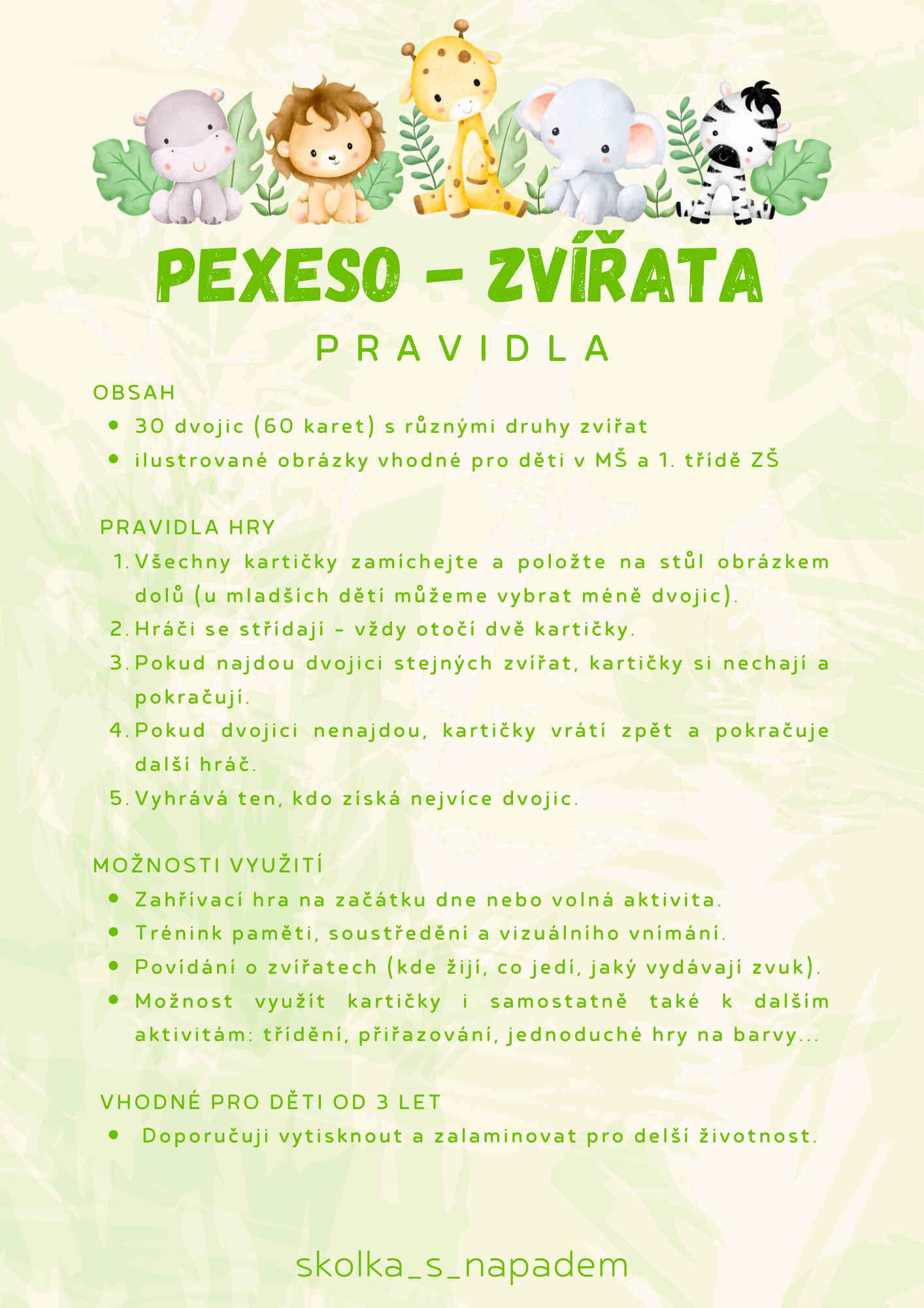 Hledáte hru, která děti zabaví a zároveň podpoří jejich paměť a soustředění? Připravila jsem pro vás pexeso se 30 dvojicemi zvířat (celkem 60 kartiček) 🦊🐻🐸🐘.