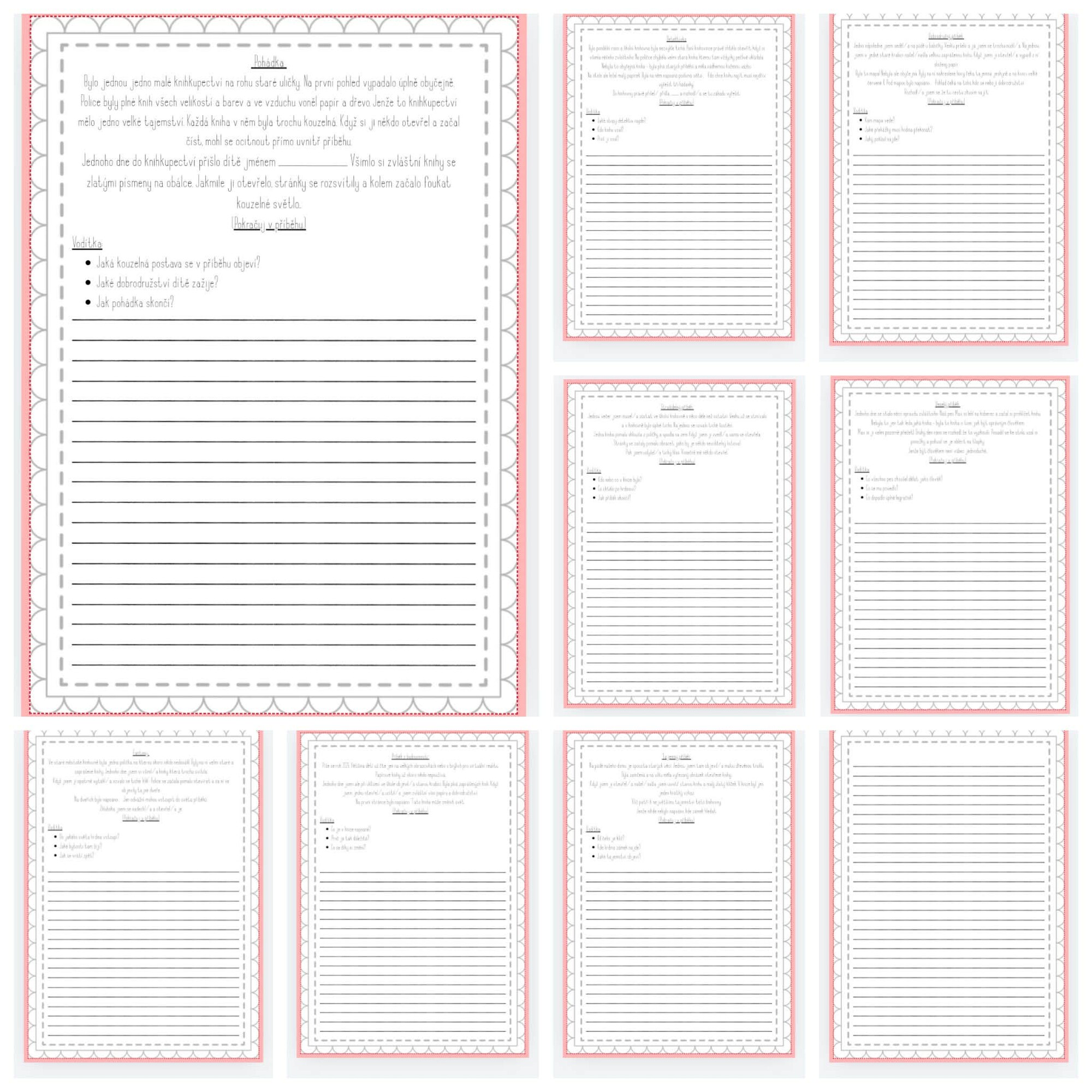 Materiál obsahuje několik začátků příběhů, které představují různé literární žánry, například pohádku, detektivku, dobrodružný příběh, fantasy, strašidelný příběh nebo příběh z budoucnosti. Každý text je doplněn o jednoduchá vodítka, která pomáhají dětem přemýšlet nad pokračováním příběhu. Díky tomu mají žáci jasnější představu o tom, jak příběh rozvíjet a jaké prvky by v něm mohly být.