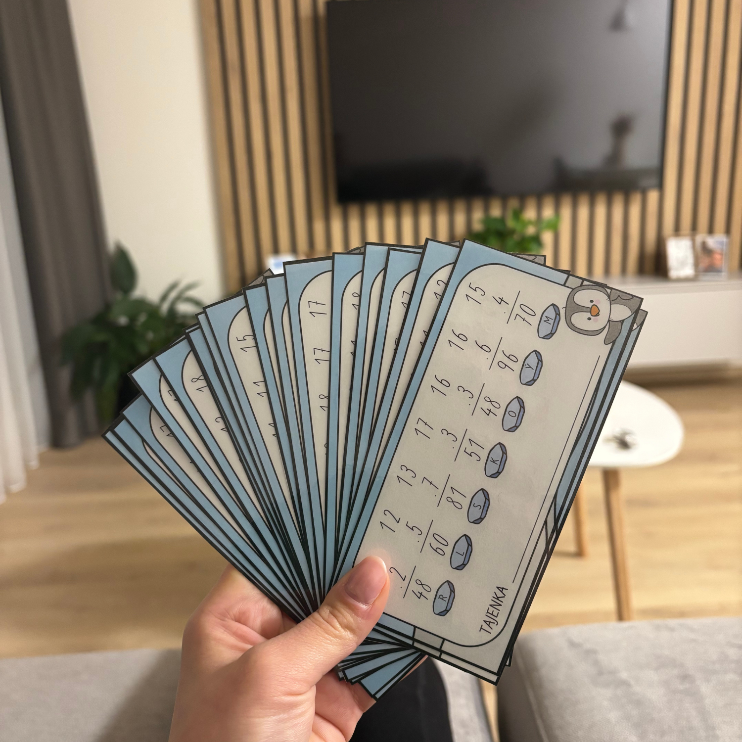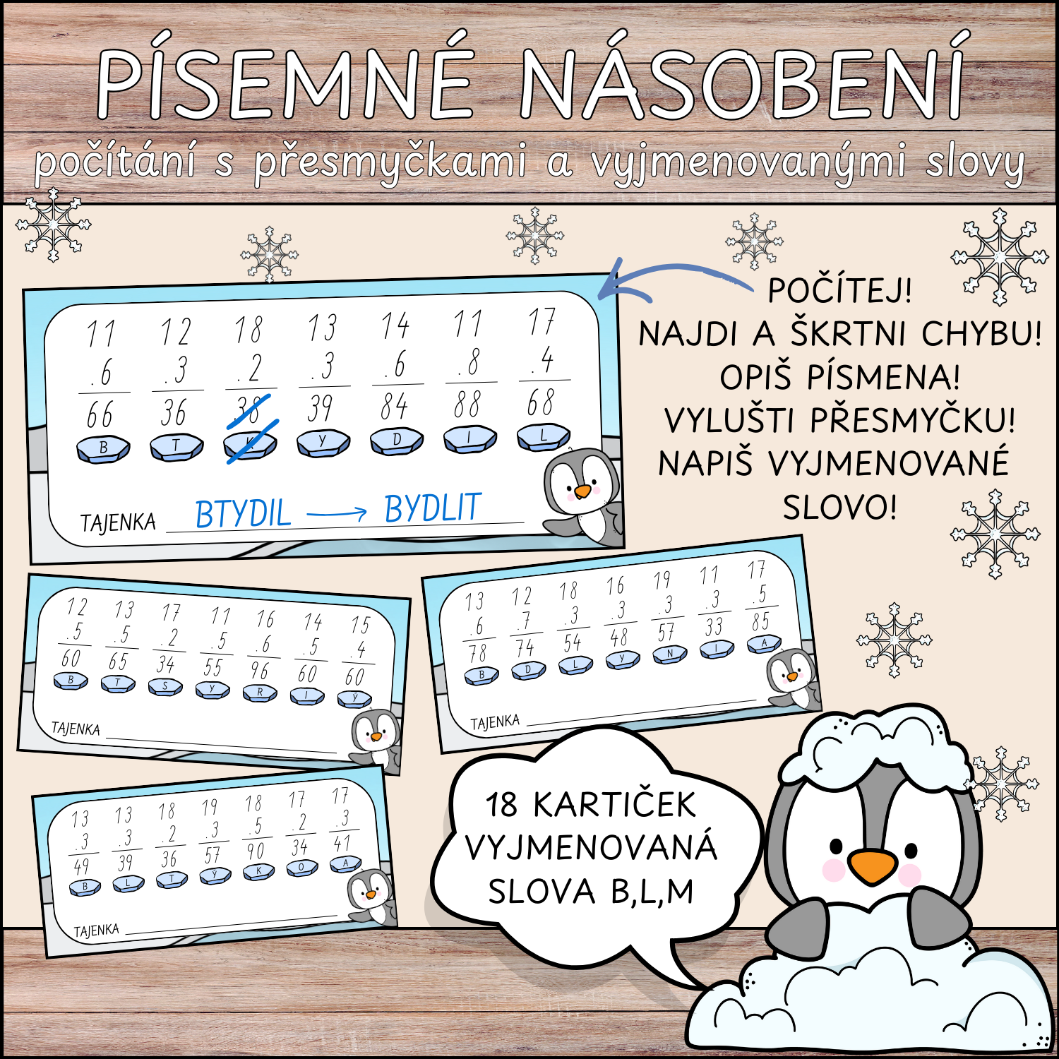 Materiál obsahuje osmnáct kartiček se zimní tematikou, které jsou zaměřené na procvičování písemného násobení a na opakování vyjmenovaných slov po B, L a M. Na kartičkách se nacházejí příklady k výpočtu a zároveň sada písmen, z nichž po správném vyškrtání vzniká přesmyčka vyjmenovaného slova.