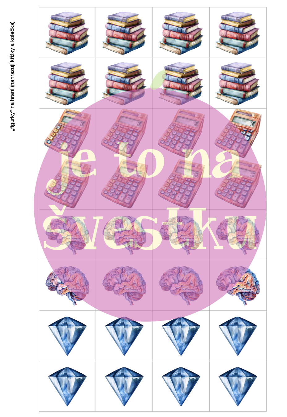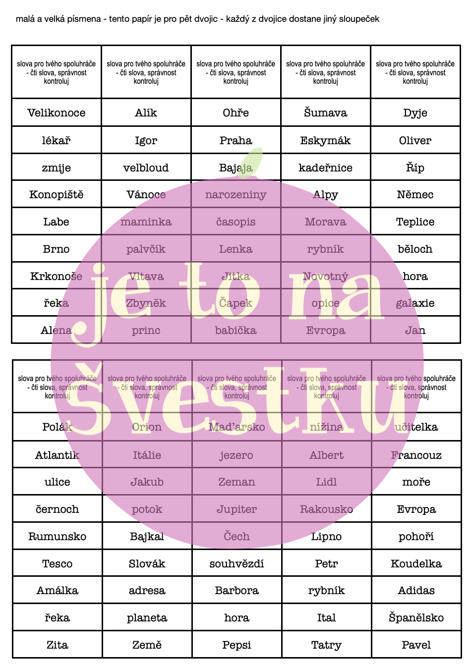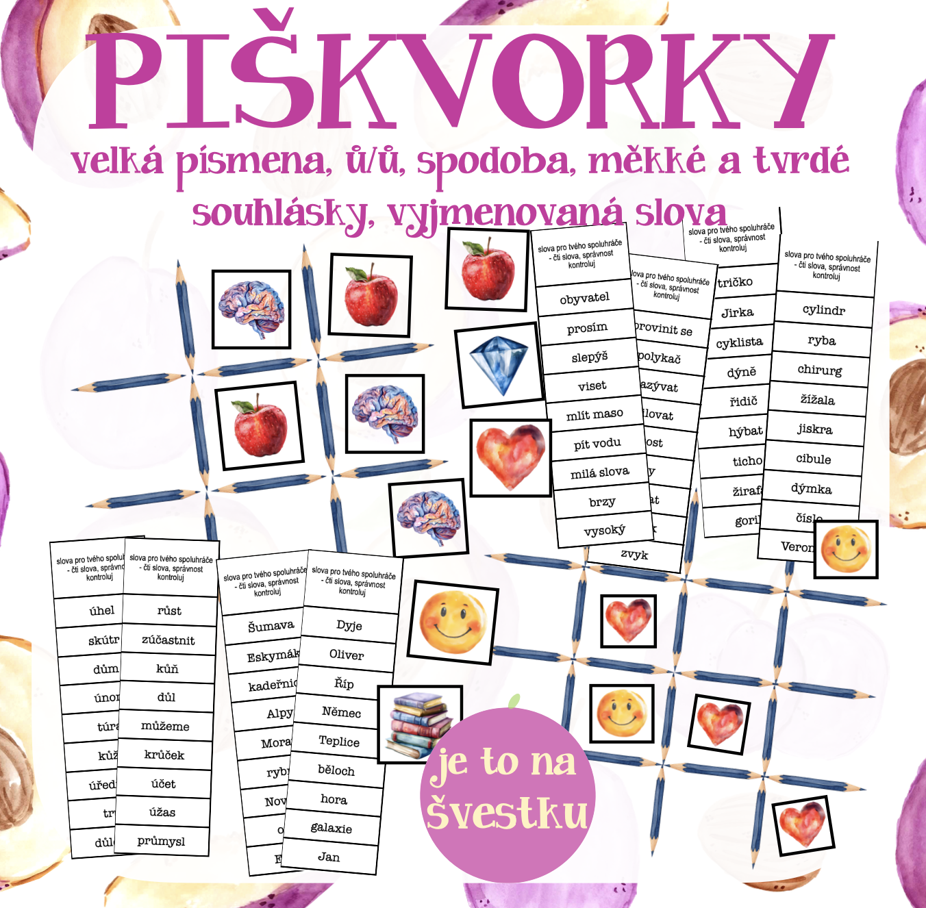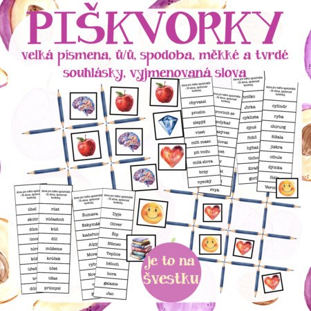 Materiál obsahuje hru piškvorky, která je vhodná pro procvičování jevů z českého jazyka. Jsou zde 2 hrací pole (3x3 a 4x4), 8 různých „figurek“ a sloupečky se slovy. Ke každému jevu je zde 10 různých sloupečků po deseti slovech. Procvičované jevy: ů/ú včetně výjimek, malá a velké písmena, měkké a tvrdé souhlásky včetně výjimek, mix vyjmenovaných slov a spodoba (ta obsahuje jen 5 různých sloupců).