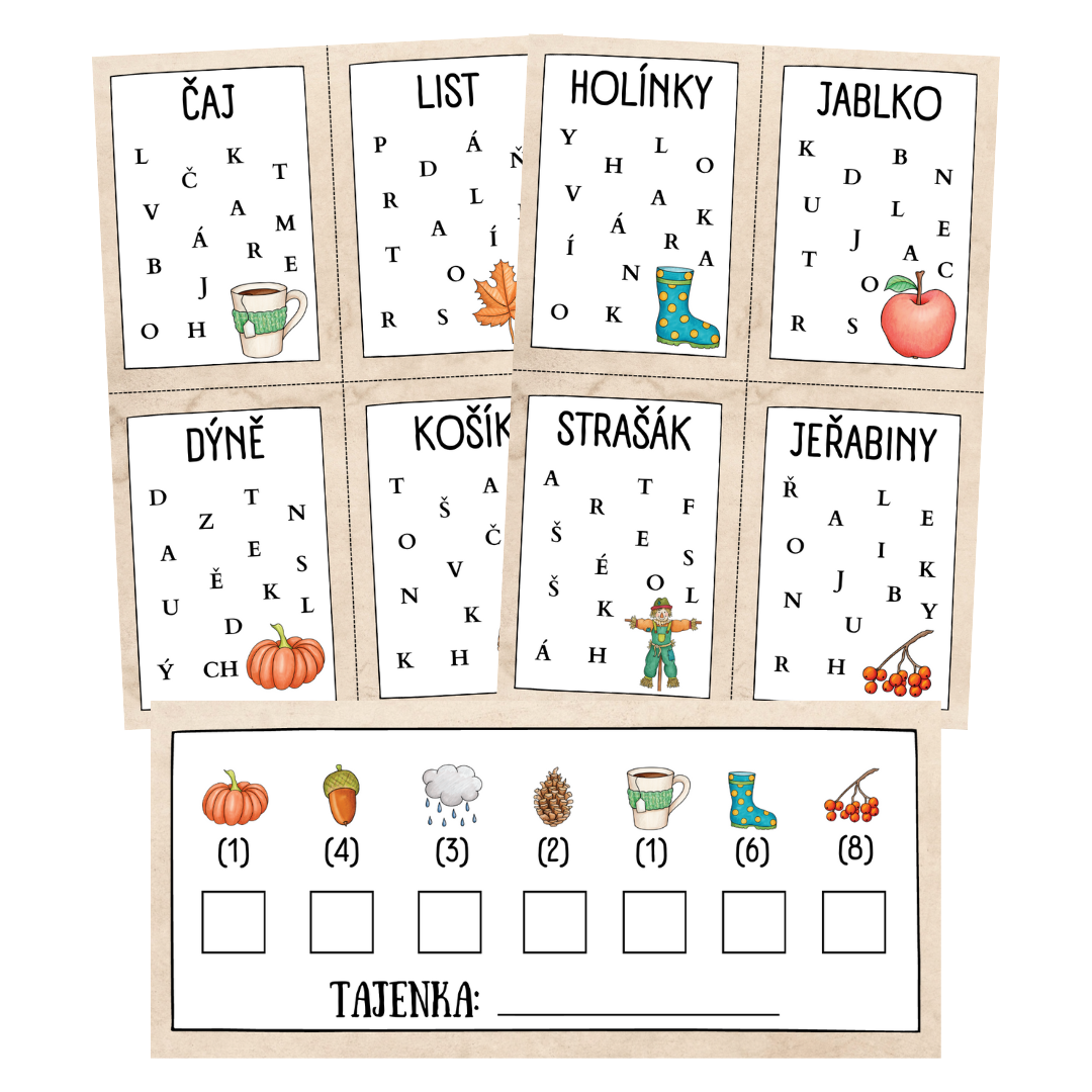 - Pokud jsou děti hotovy mohou: u černobílé verze vymalovat v rohu obrázek a nebo dostanou kartičku s tajenkou, kde do rámečku zapisují to písmenko, které je v pořadí v závorce (např. (2) = druhé písmenko ve slově). Pokud pracují správně, měla by vyjít tajenka.