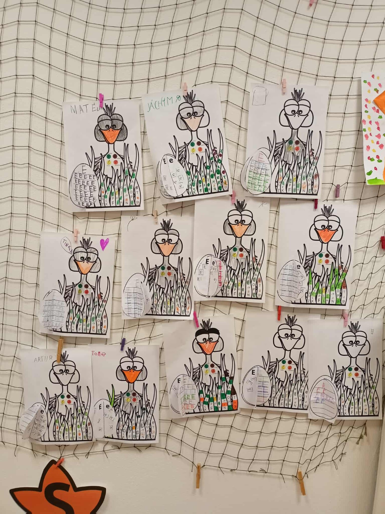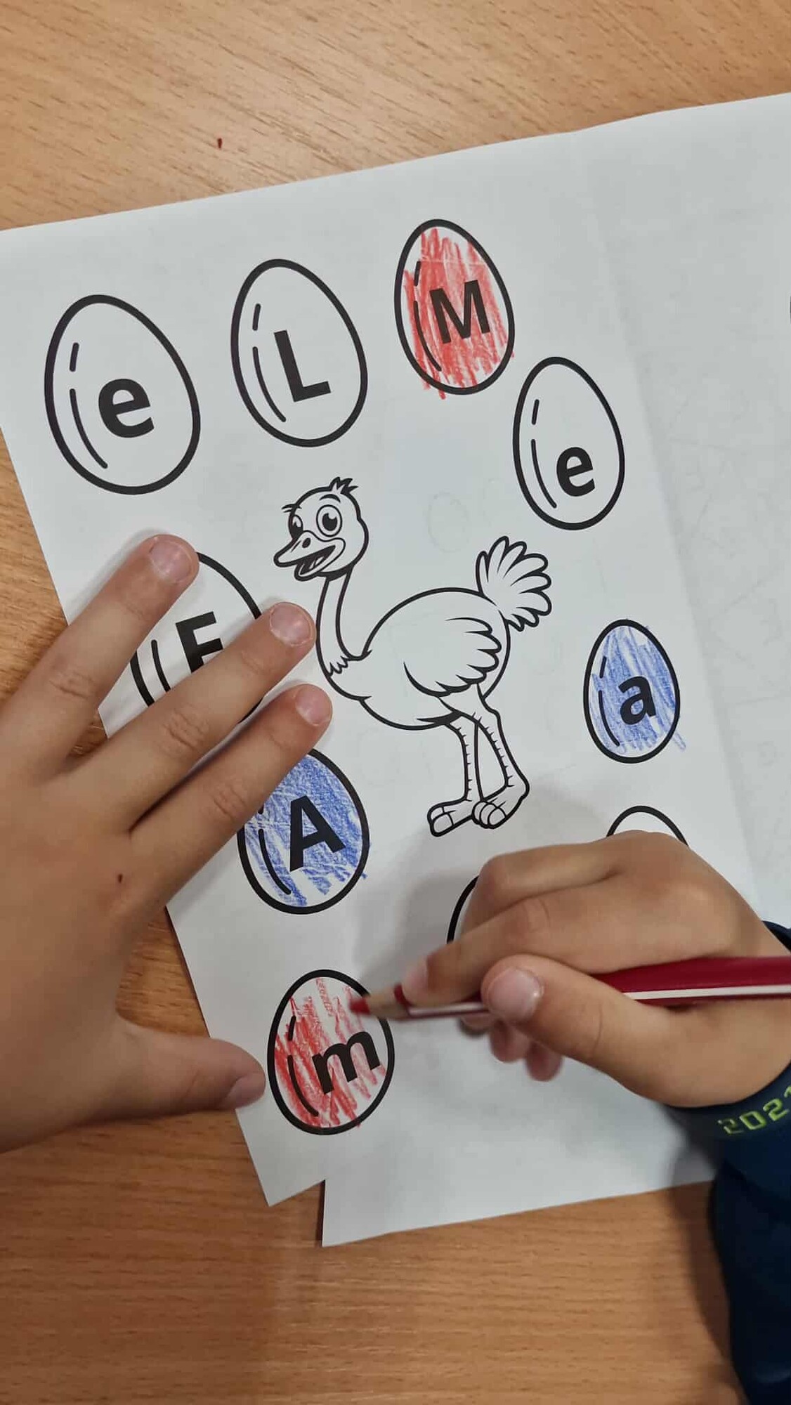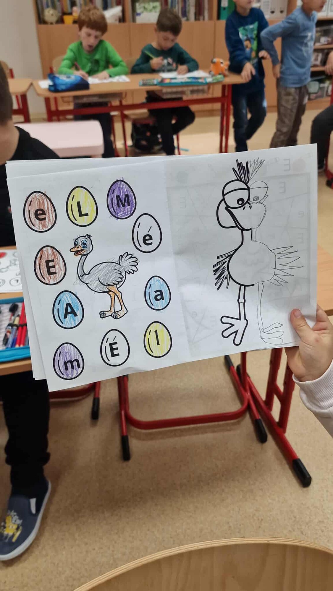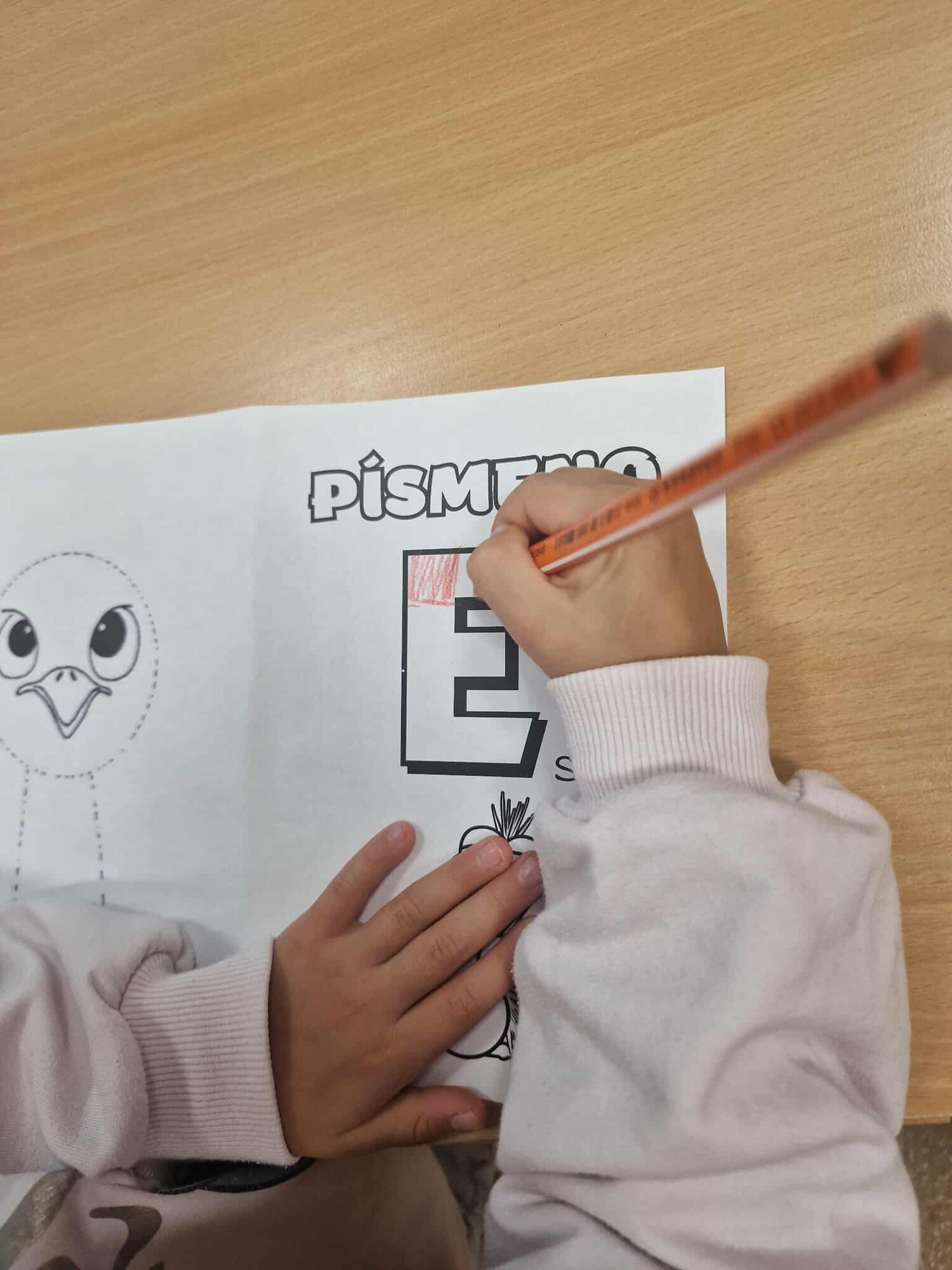 PŠTROS EMU – PL – označování tvarů písmen podle zadání + lepení 3D VEJCE – do