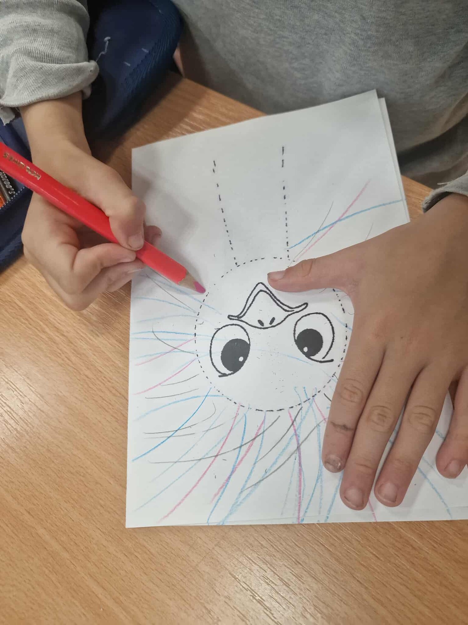 DOKRESLI PŠTROSA – čarami kolem hlavy, různými barvami děti kreslí