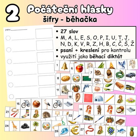 Slova jsou zašifrována pomocí obrázků – děti určují počáteční hlásky jednotlivých obrázků a skládají výsledné slovo.