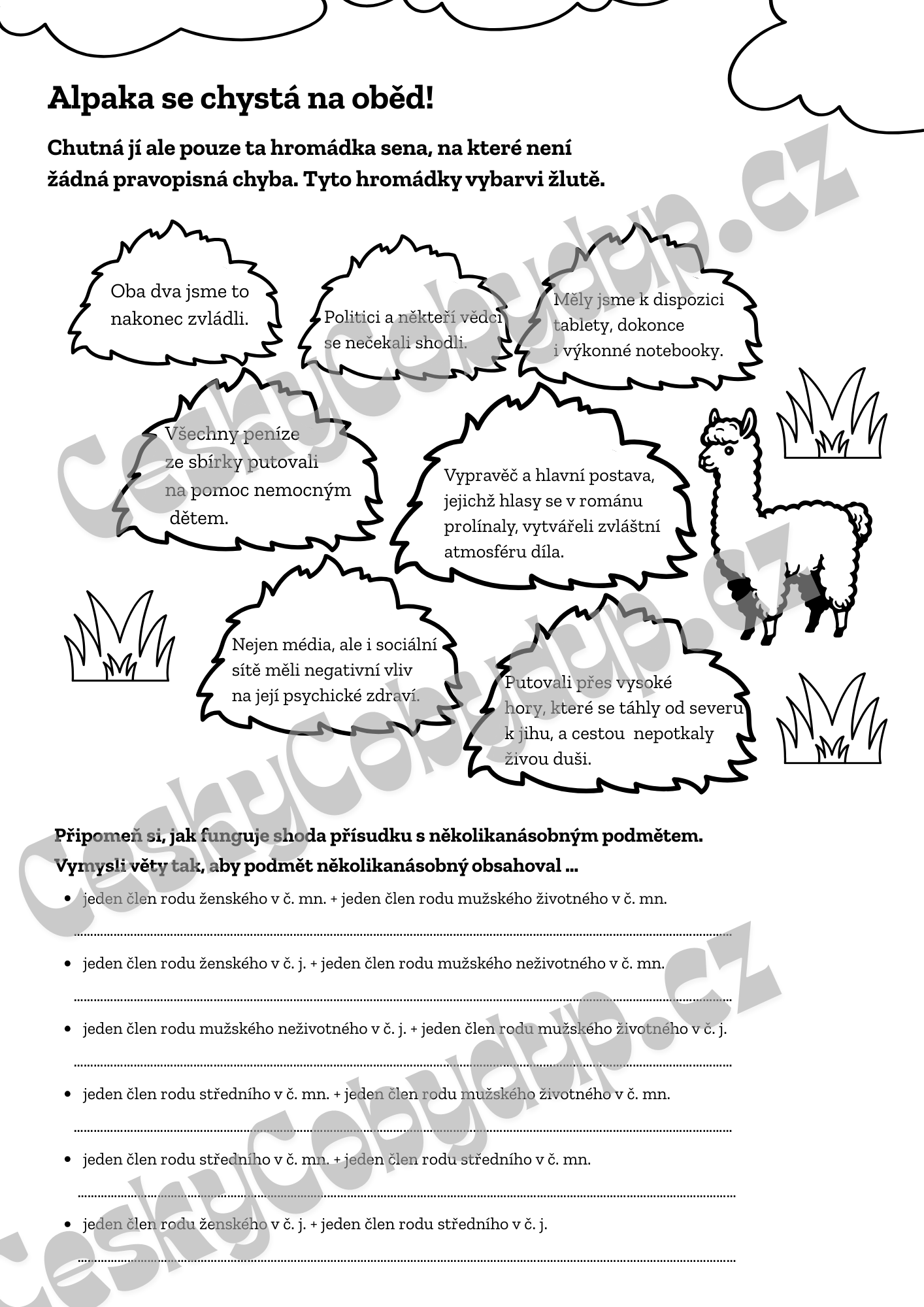 6.strana: pravopis s alpakou + několikanásobný podmět ve shodě podmětu s přísudkem