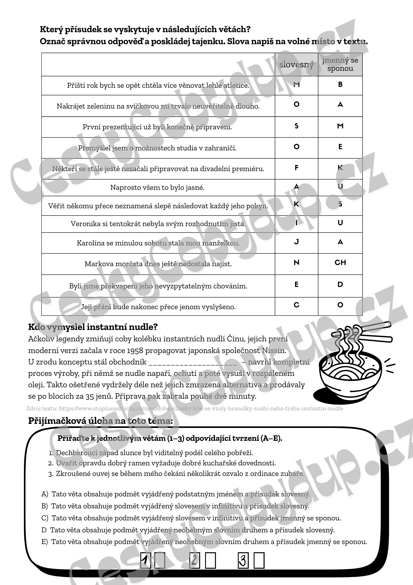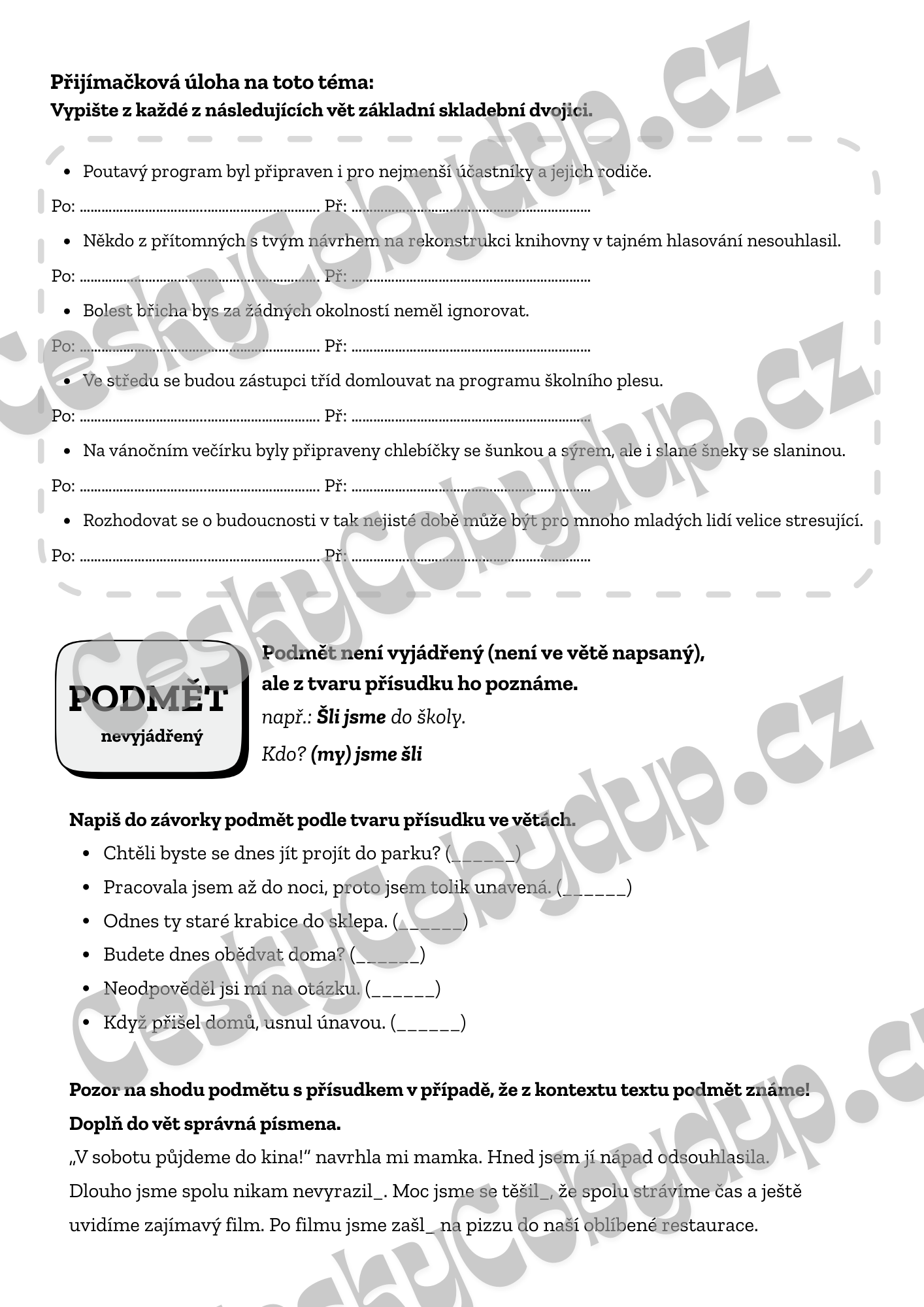 3.strana: ukázka přijímačkové úlohy na toto téma, podmět nevyjádřený + úloha