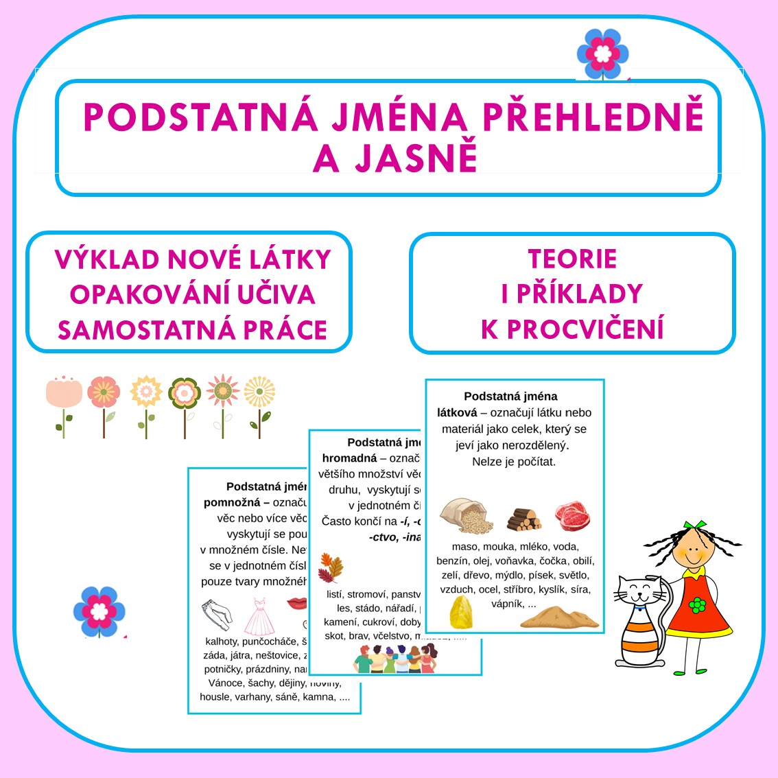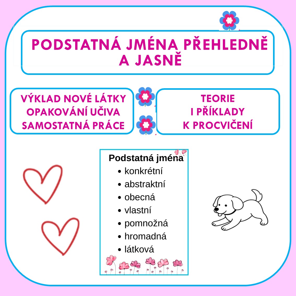Jednotlivé druhy podstatných jmen v teoretické části jsou doplněny stručným vysvětlením a názornými příklady, které usnadňují pochopení učiva. Materiál je určen k přehlednému vysvětlení, procvičení a upevnění učiva o druzích podstatných jmen. Je vhodný jak pro výklad nové látky, tak pro opakování a samostatnou práci žáků. Díky názorným příkladům je učivo pro žáky srozumitelnější a lépe zapamatovatelné.