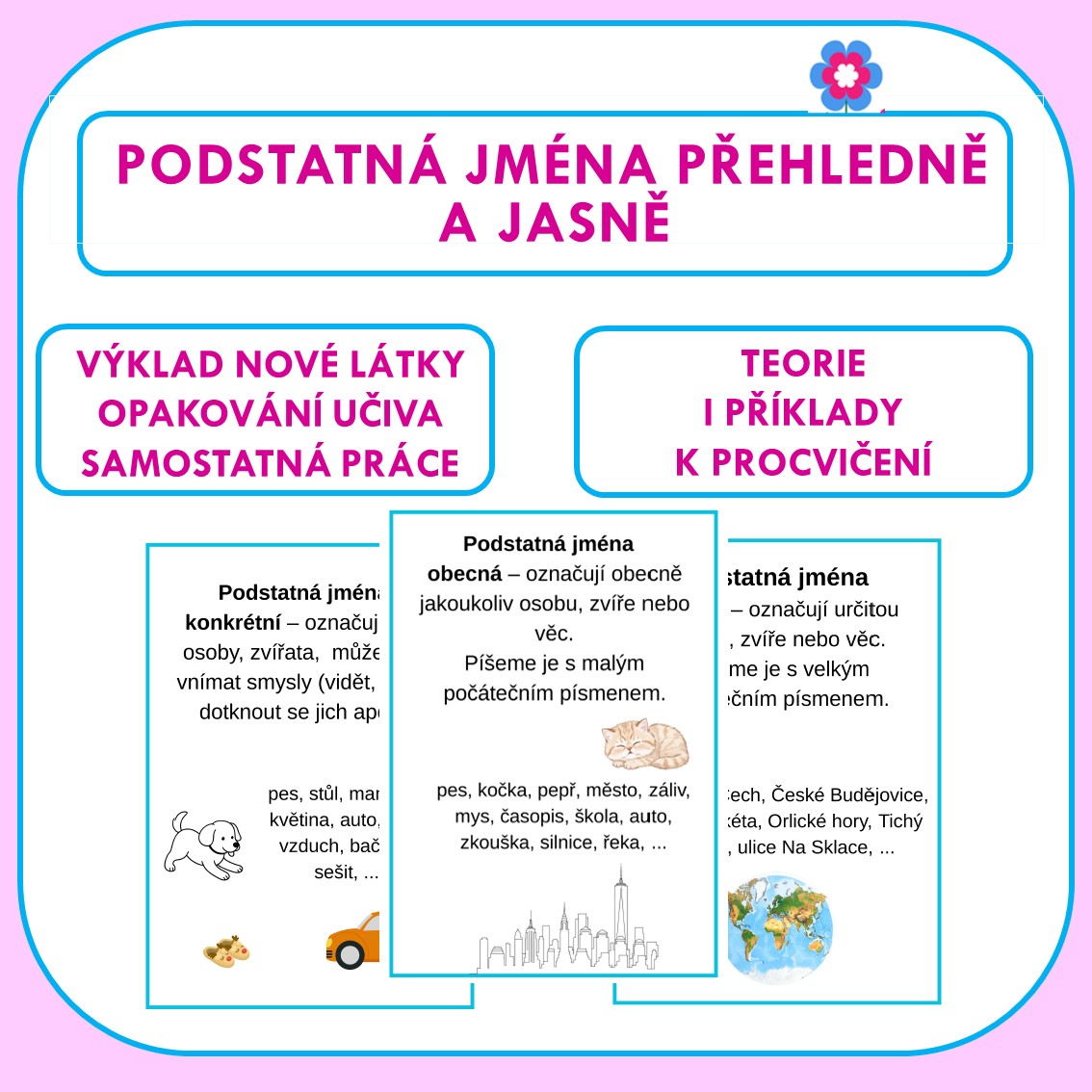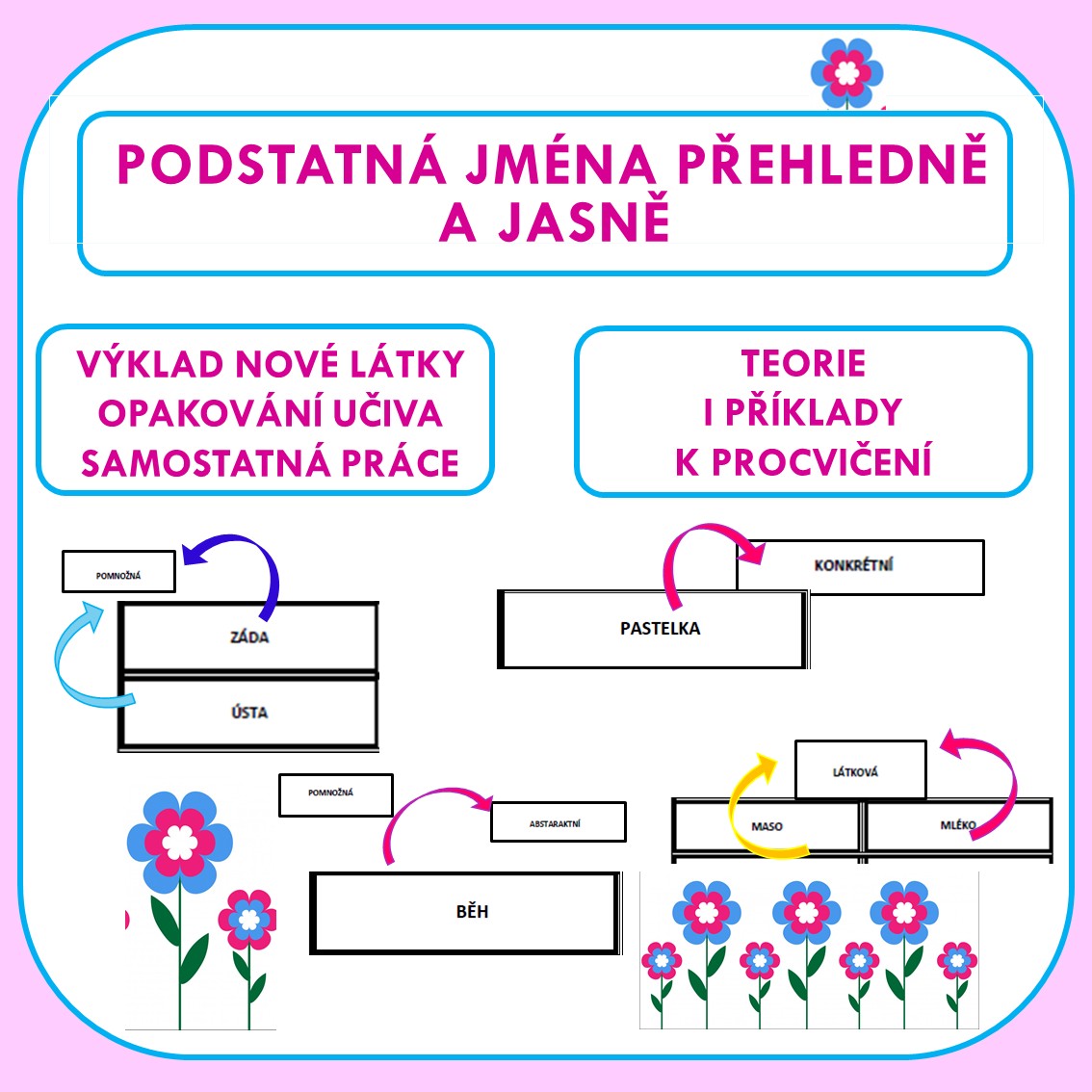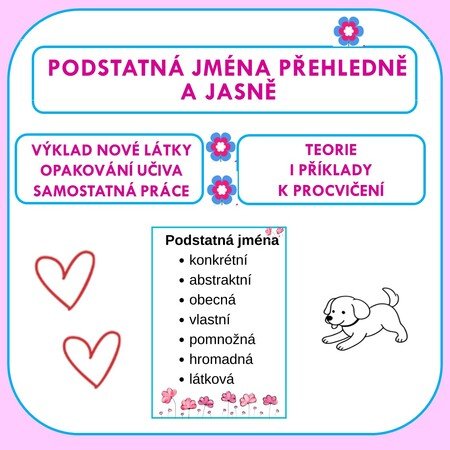 Cílem materiálu je usnadnit orientaci v učivu o podstatných jménech a podpořit správné rozlišování jejich jednotlivých druhů.