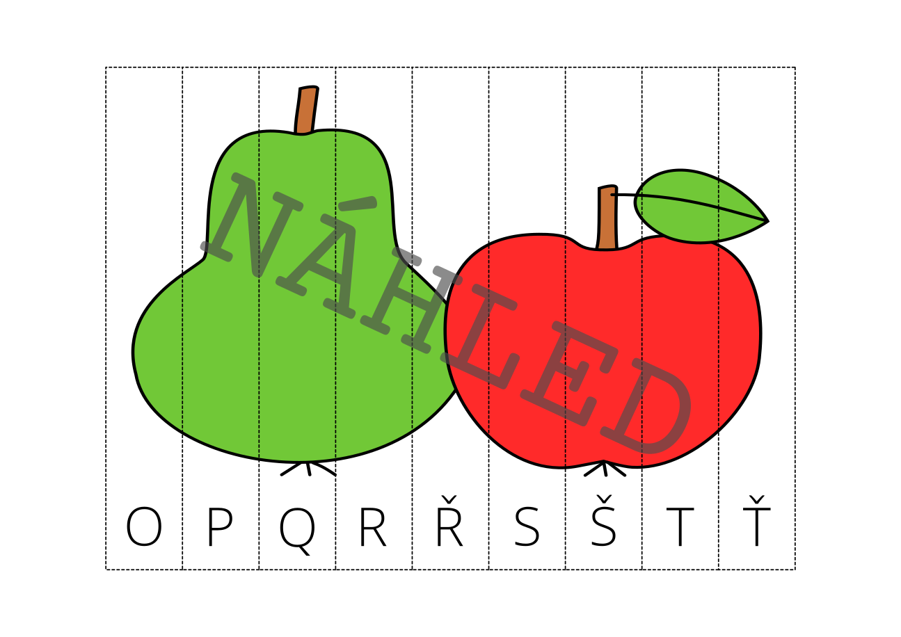 Vybrané stránky se skládačkami vytiskněte. Skládačky rozstříhejte podle přerušovaných čar. Jednotlivé části skládaček můžete zalaminovat. Děti skládají obrázky. Jednotlivé části skládačky musí být seřazeny tak, aby písmena na nich byla řazena abecedně.