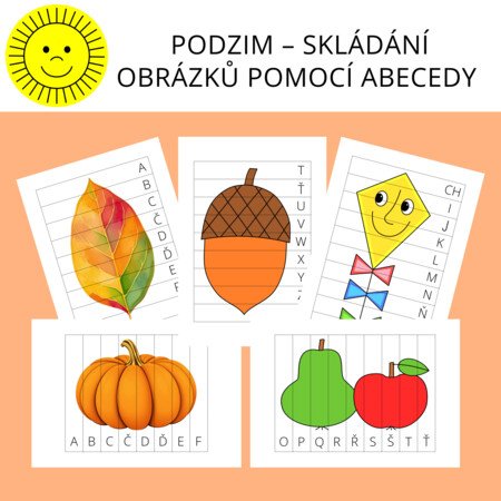 Materiál obsahuje skládačky pěti podzimních obrázků (list, drak, hruška a jablko, žalud, dýně).