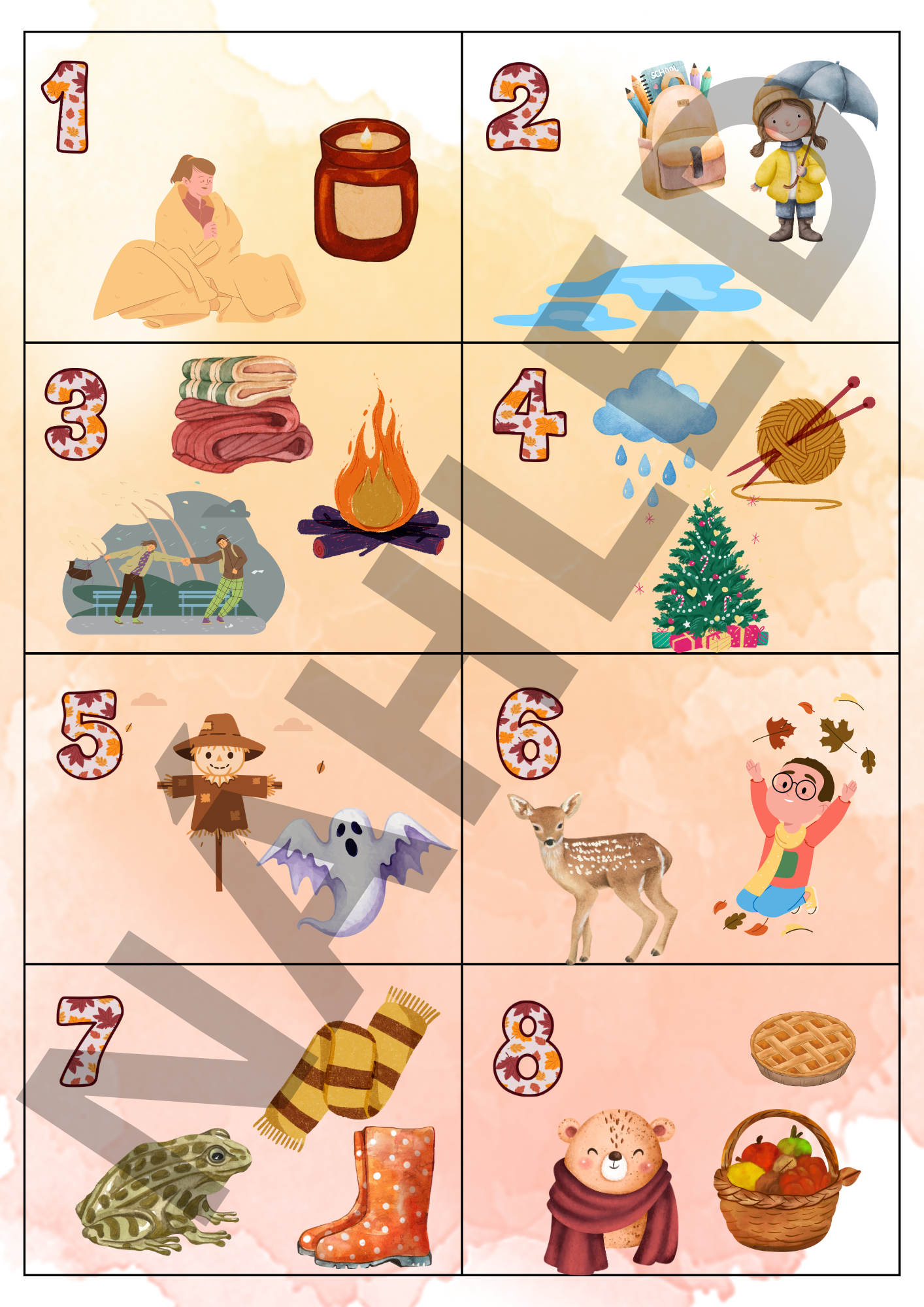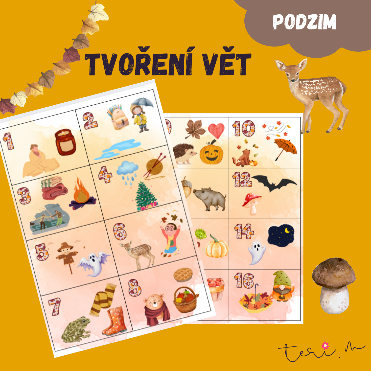 Podzimní sada „Tvoříme věty - Podzim“ přináší 32 barevných kartiček, které rozvíjejí slovní zásobu, představivost a tvořivost dětí. Každá kartička s 2–3 obrázky inspiruje žáky k tvorbě vět nebo krátkých příběhů. Skvělá pomůcka pro hodiny českého jazyka, sloh i ranní jazyková cvičení. 🍁