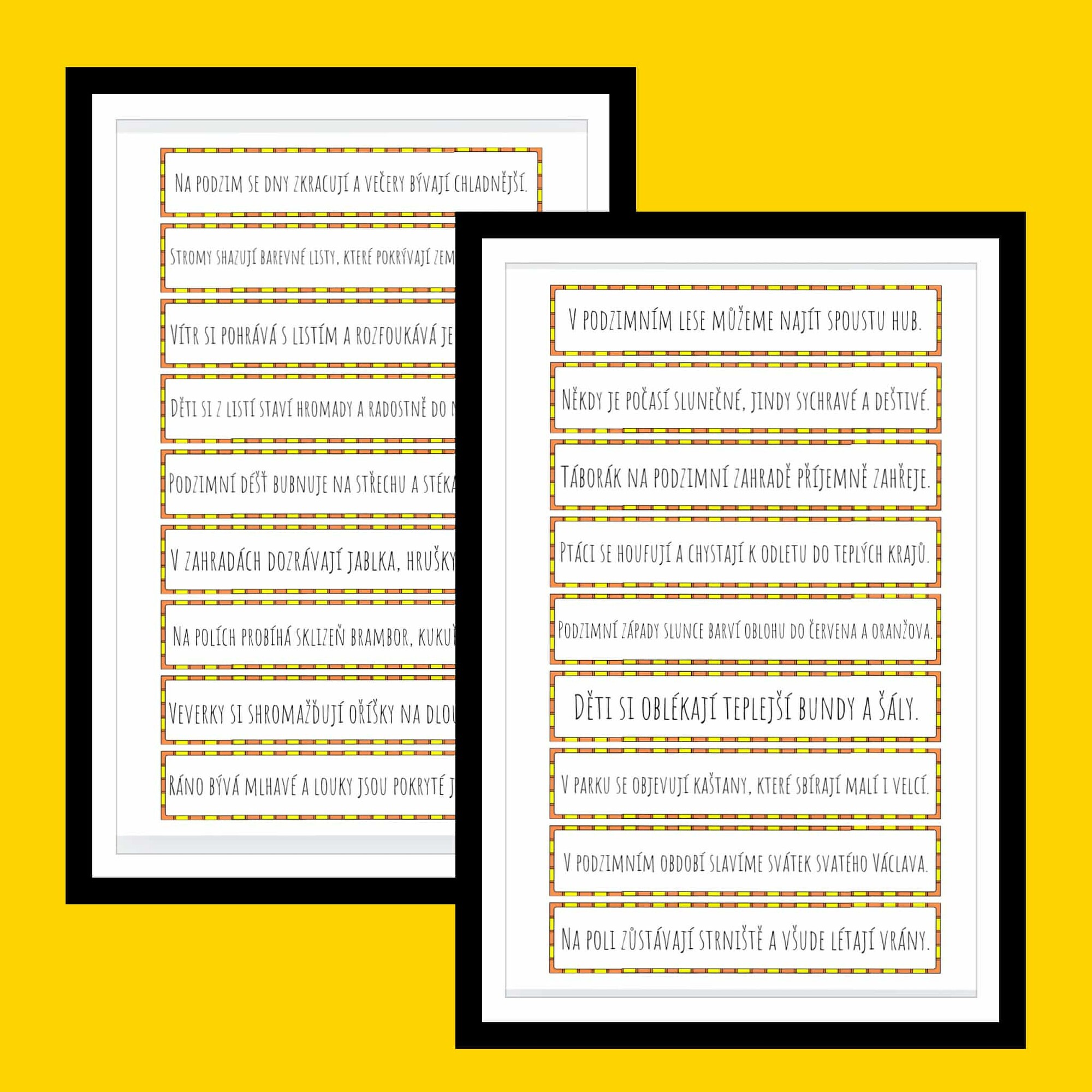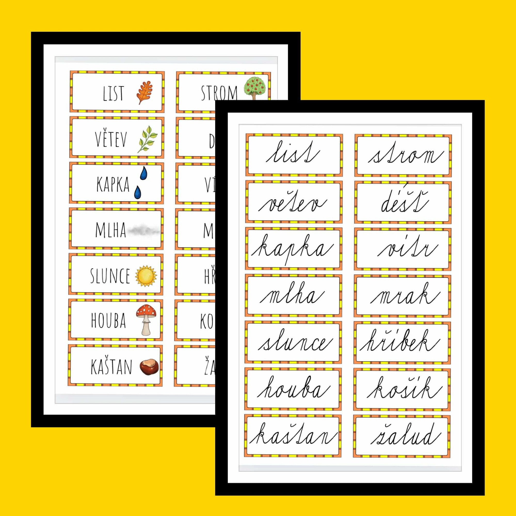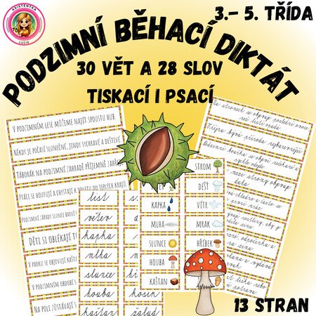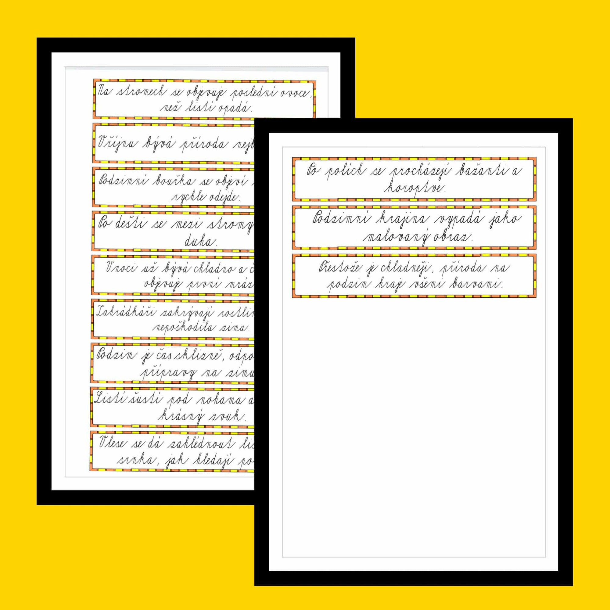 Tento materiál je zaměřen na tematický celek podzim a obsahuje 28 slov a 30 vět v tiskací i psací podobě. Je určen k procvičování čtení a psaní žáků druhého ročníku a lze jej využít jak k opisu, tak k běhacímu diktátu. Texty reflektují charakteristické jevy podzimu, jako jsou změny v přírodě, barevné listí, sklizeň ovoce a zeleniny nebo hry venku při typickém podzimním počasí.