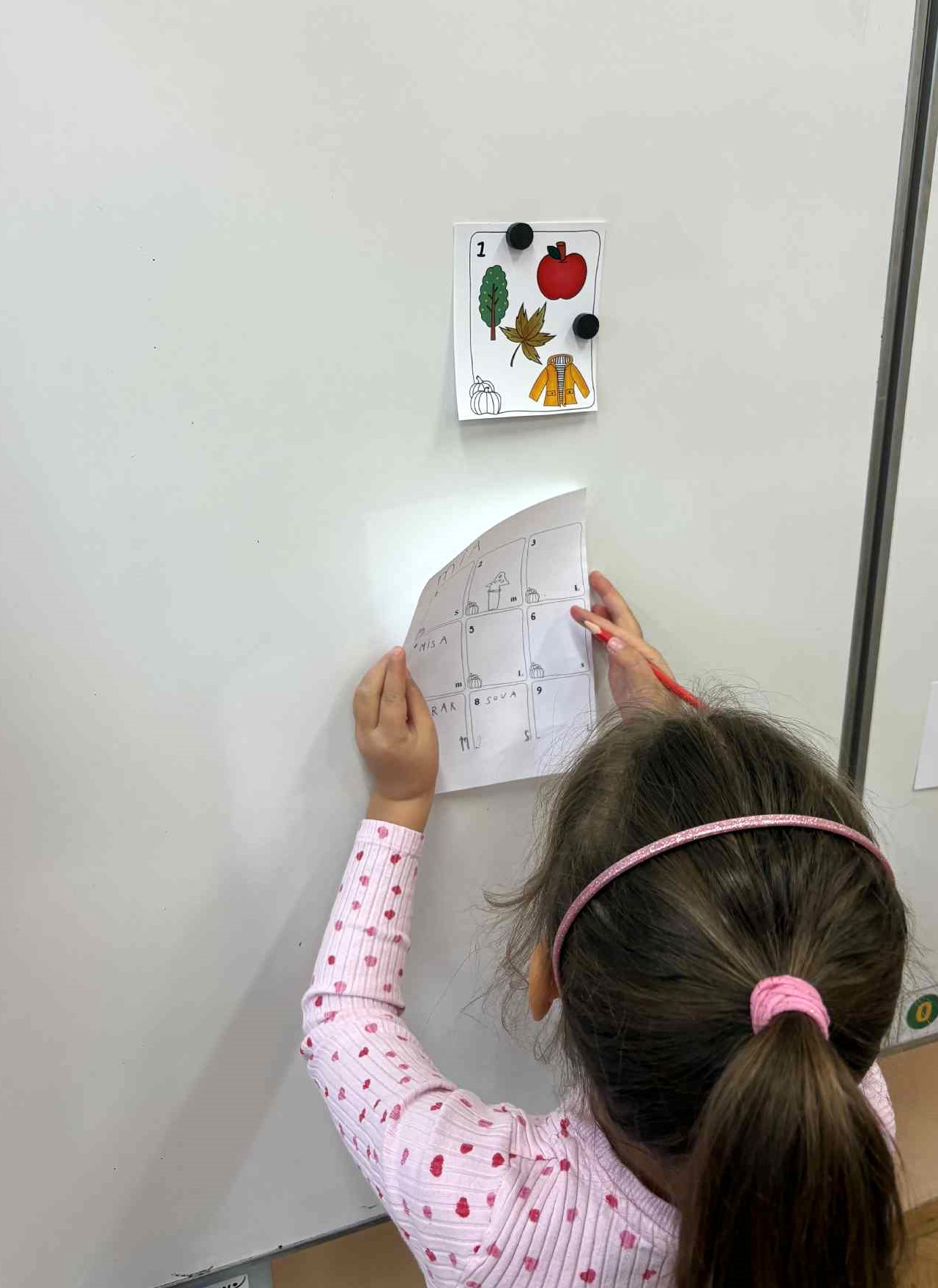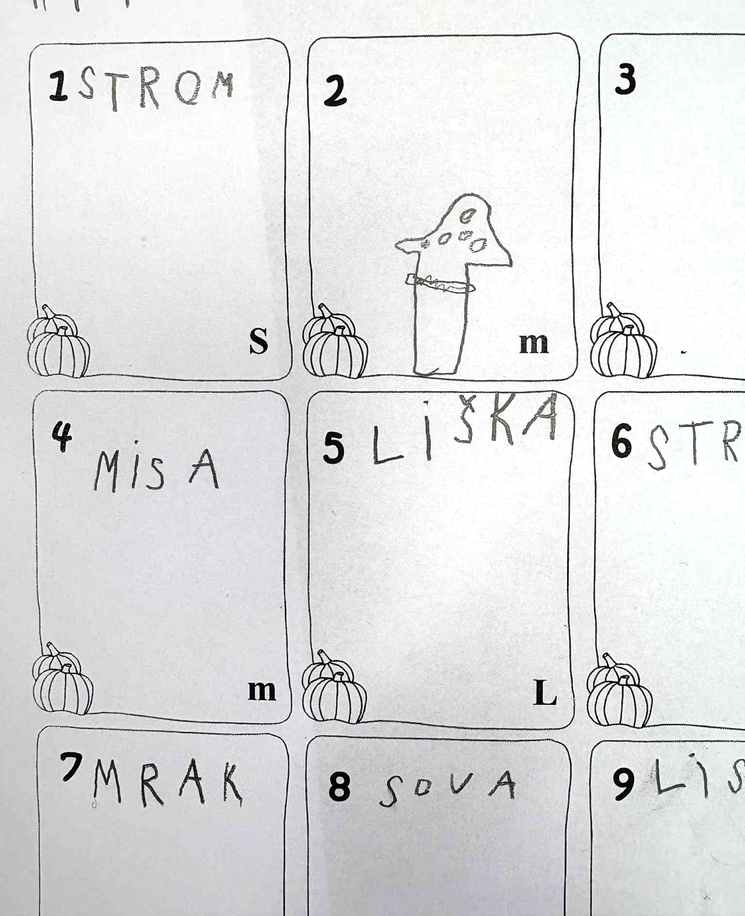 9 karet se 4 obrázky a zadaným písmenem, zapisovací karta
