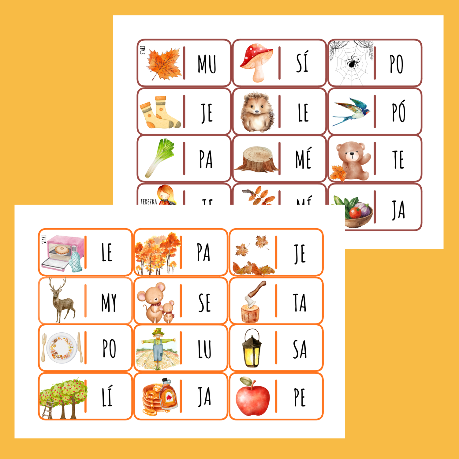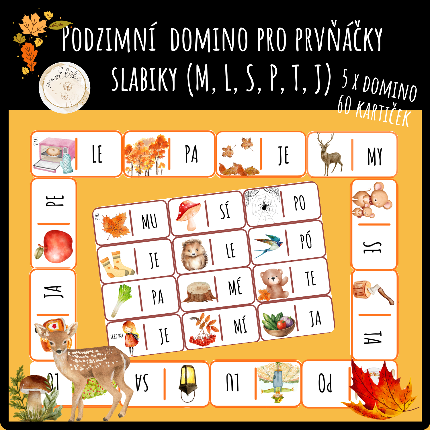 Název materiálu: Podzimní domino pro prvňáčky - slabiky (M, L, S, P, T, J)