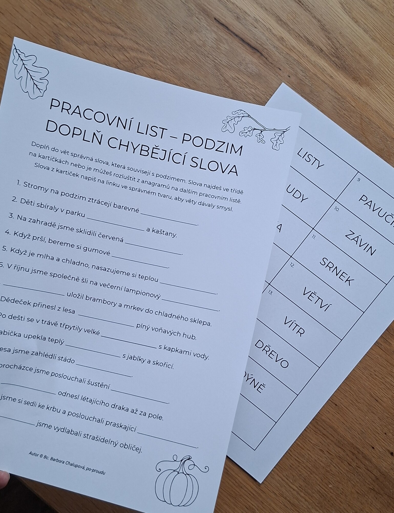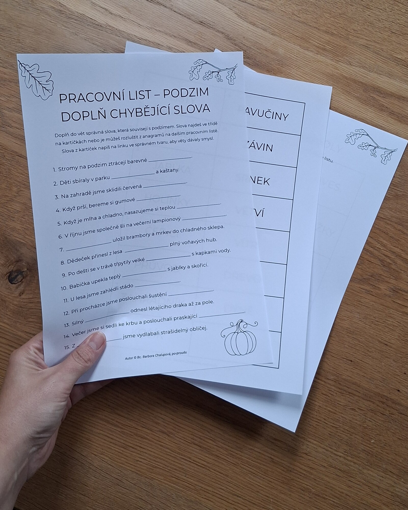 - Pracovní list – doplňovačka: 15 vět s chybějícími slovy z podzimní tematiky.