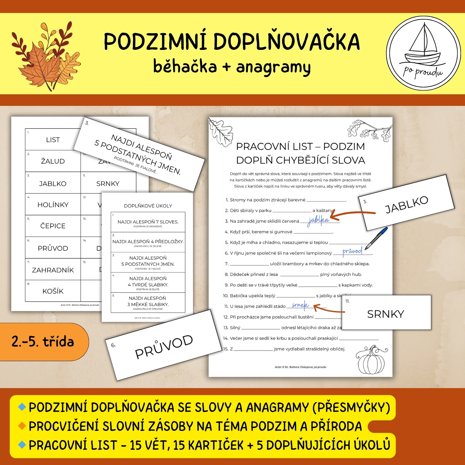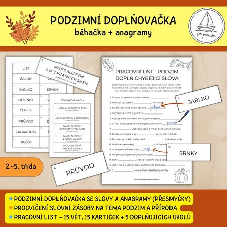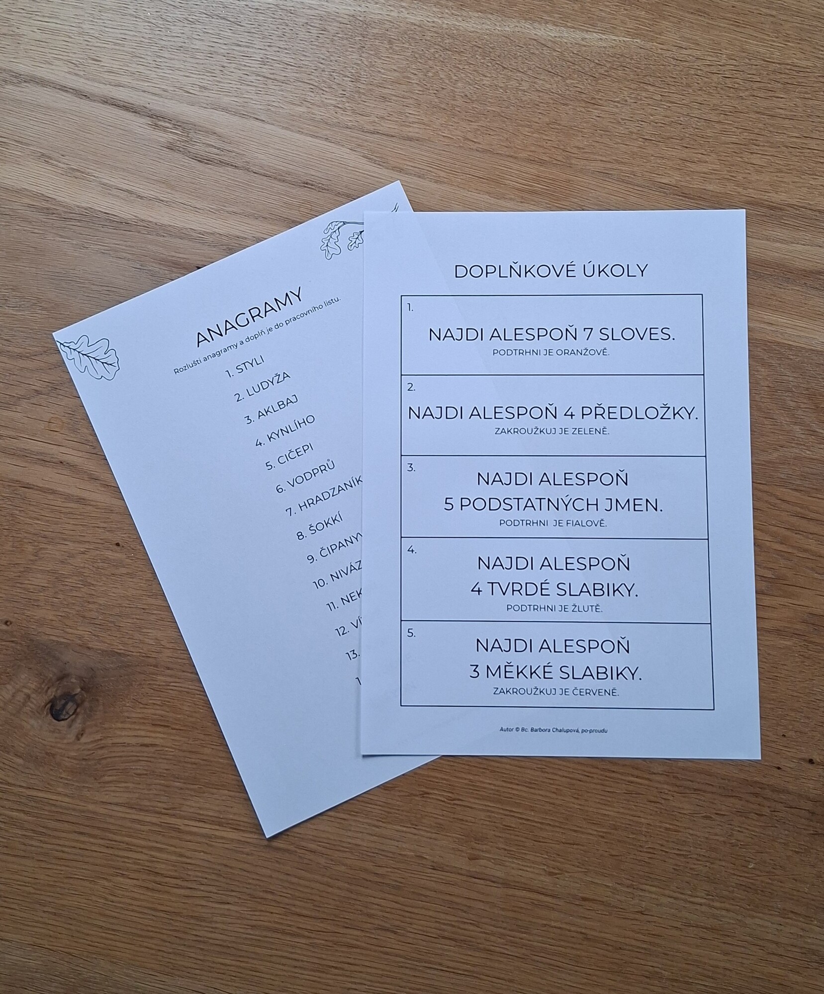 - Anagramy (přesmyčky): sada 15 slov (listy, žaludy, jablko, holínky, čepice, průvod, zahradník, košík, pavučina, závin, srnky, větev, vítr, dřevo, dýně).