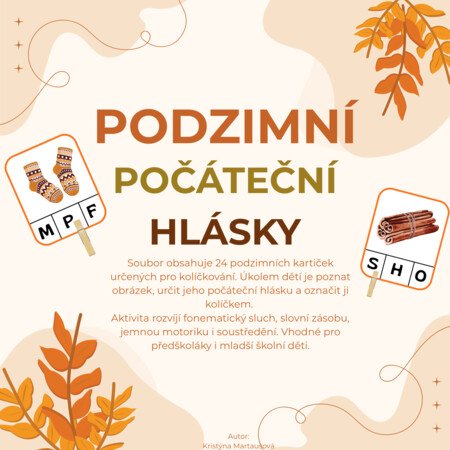 Tento materiál je určený pro rozvoj jazykových a motorických dovedností dětí v předškolním věku. Najdete v něm 24 barevných kartiček s podzimními motivy (např. jablko, hříbek, list, kaštan aj.), které jsou připraveny k jednoduchému využití při kolíčkování. Úkolem dítěte je pojmenovat obrázek, určit jeho počáteční hlásku a správně ji označit kolíčkem.