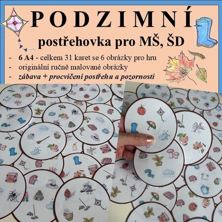 Materiál obsahuje originální ručně kreslené obrázky (31) a celkem 6 stran A4 s 31 kartičkami na nichž je vždy 6 obrázků s podzimní tematikou. Hru využijí hlavně učitelé v MŠ, děti v družině nebo rodiče doma se svými dětmi.
