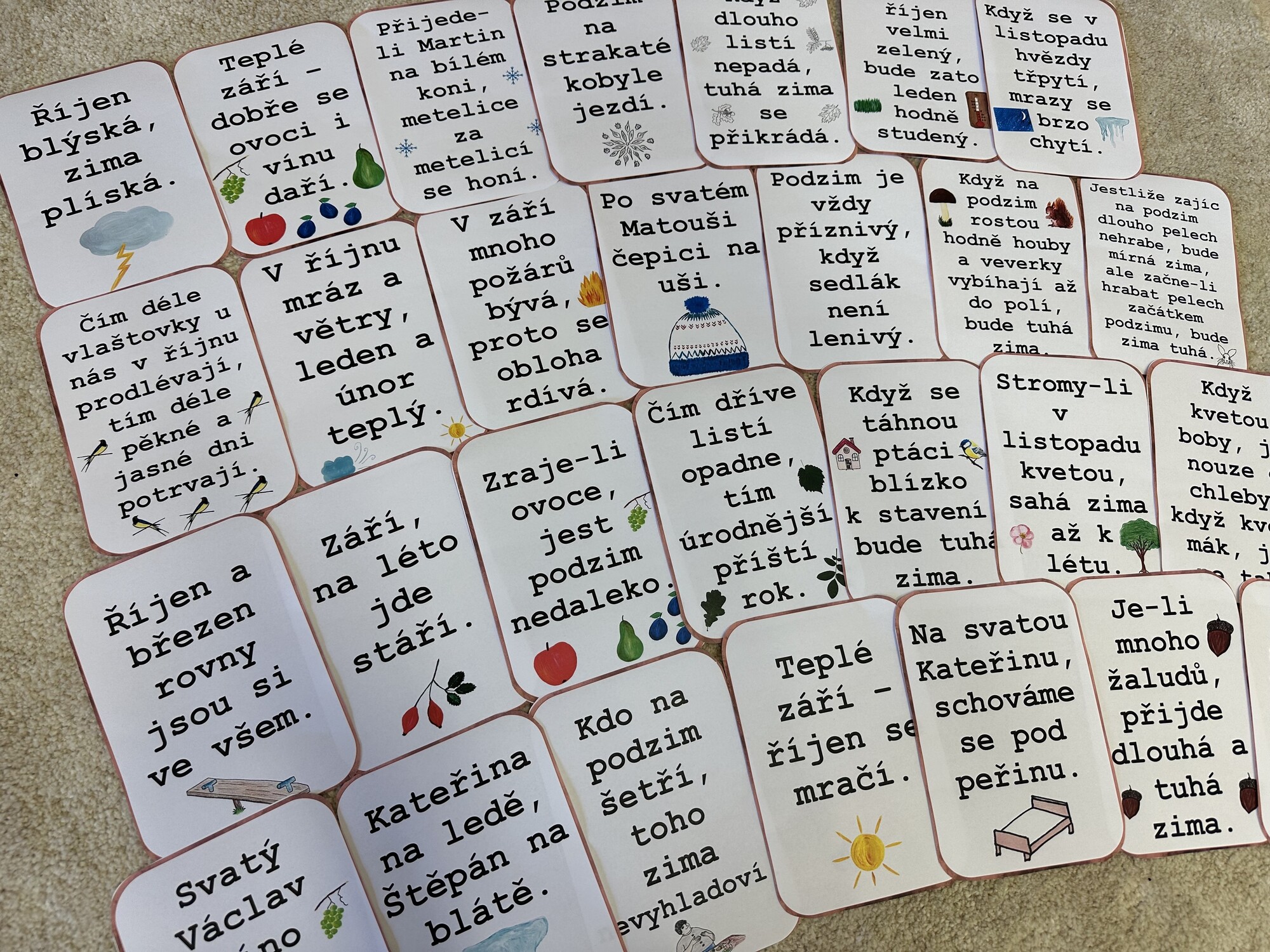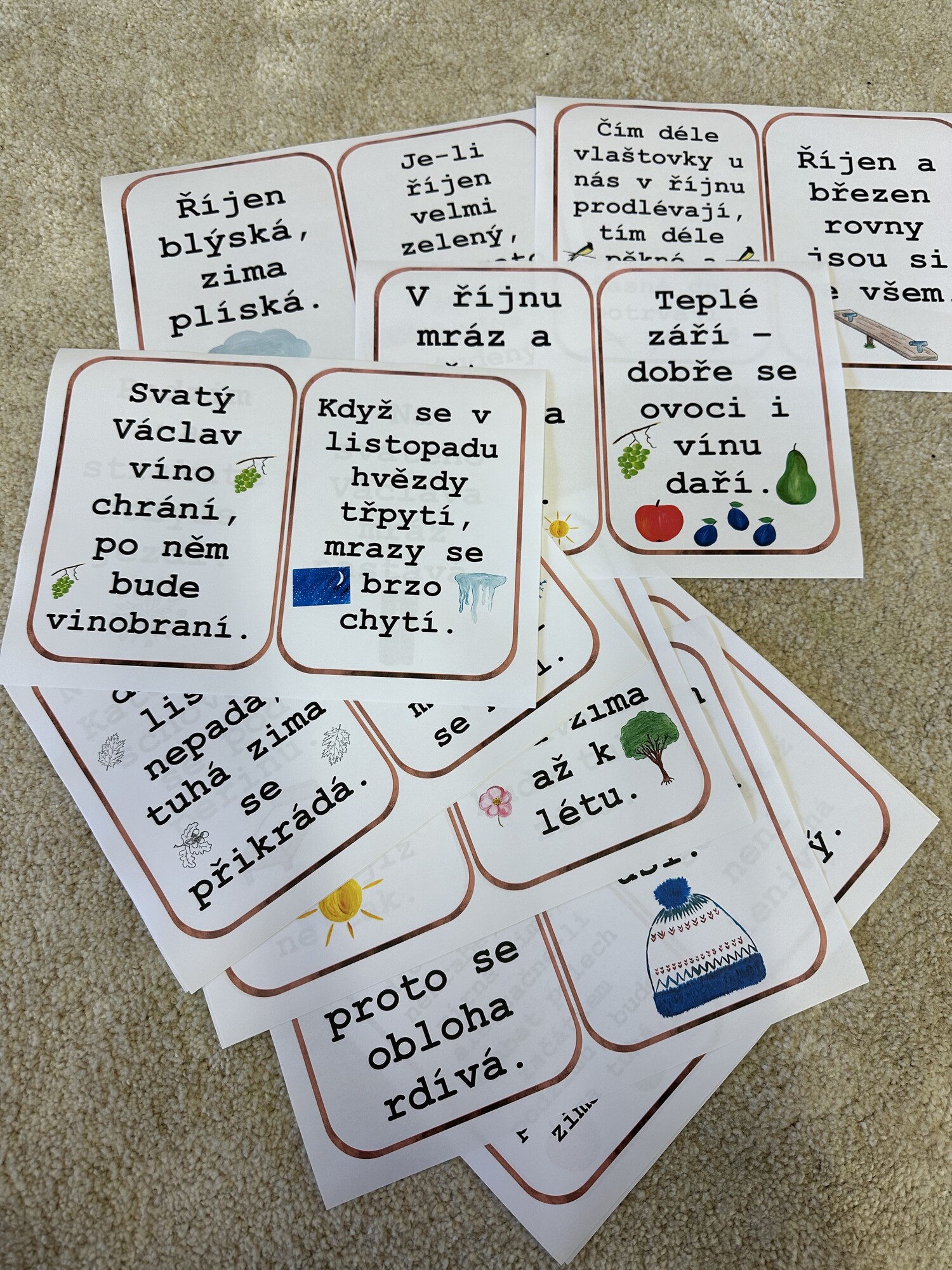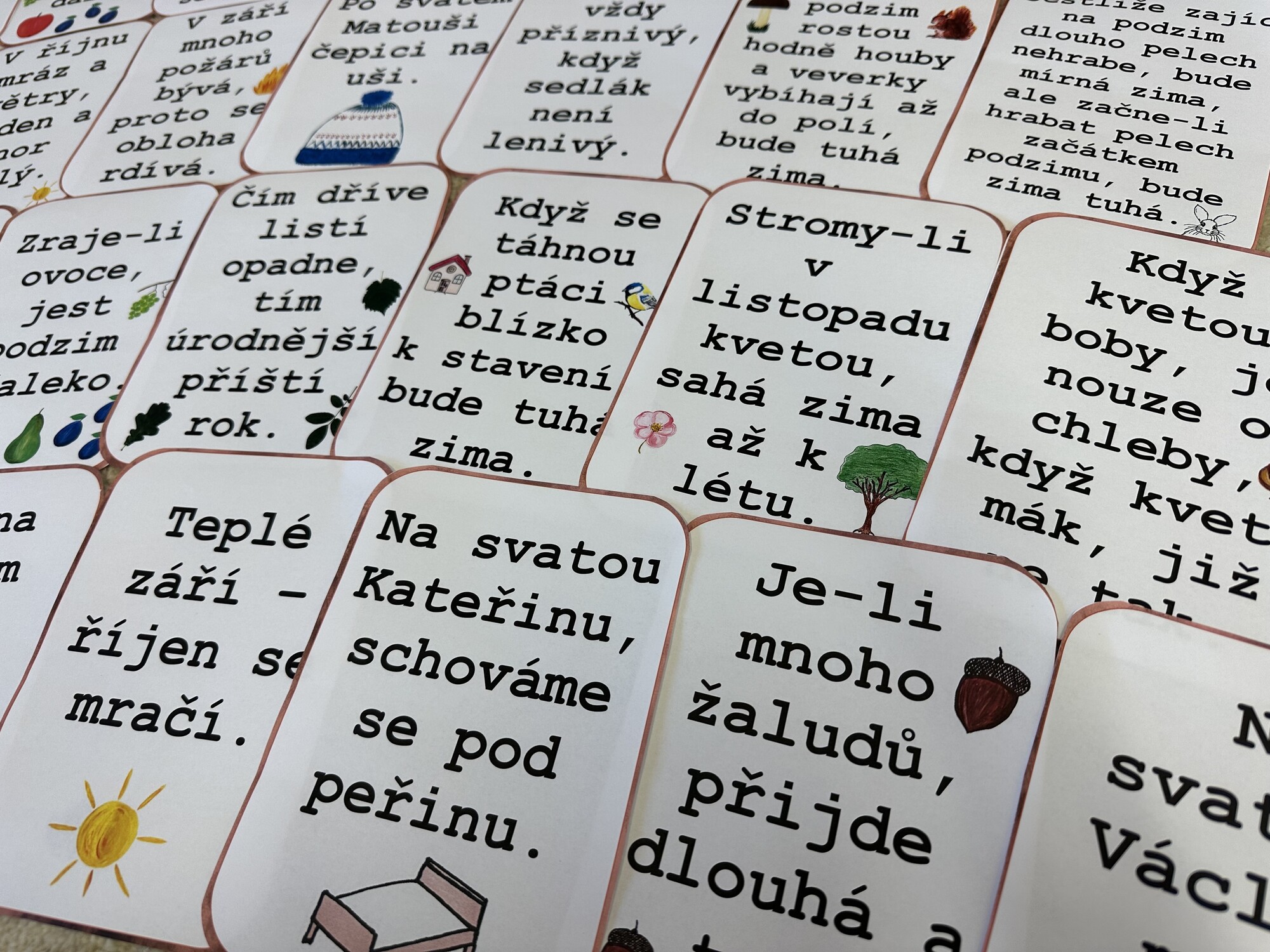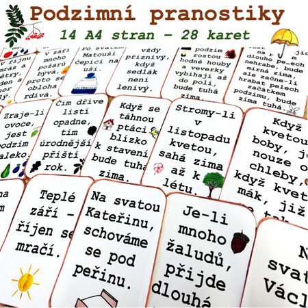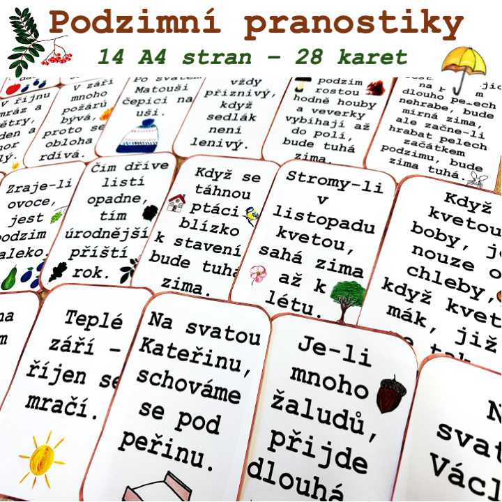 Materiál obsahuje 14 A4 stran – 28 A5 karet s podzimními pranostikami k výuce nebo k výzdobě třídy. Ručně malované a kreslené obrázky.
