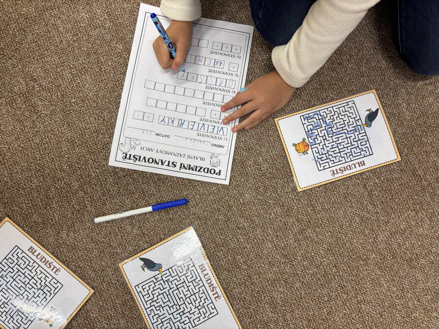 Děti plní úkoly na jednotlivých stanovištích. Na každém stanovišti získají část tajenky.