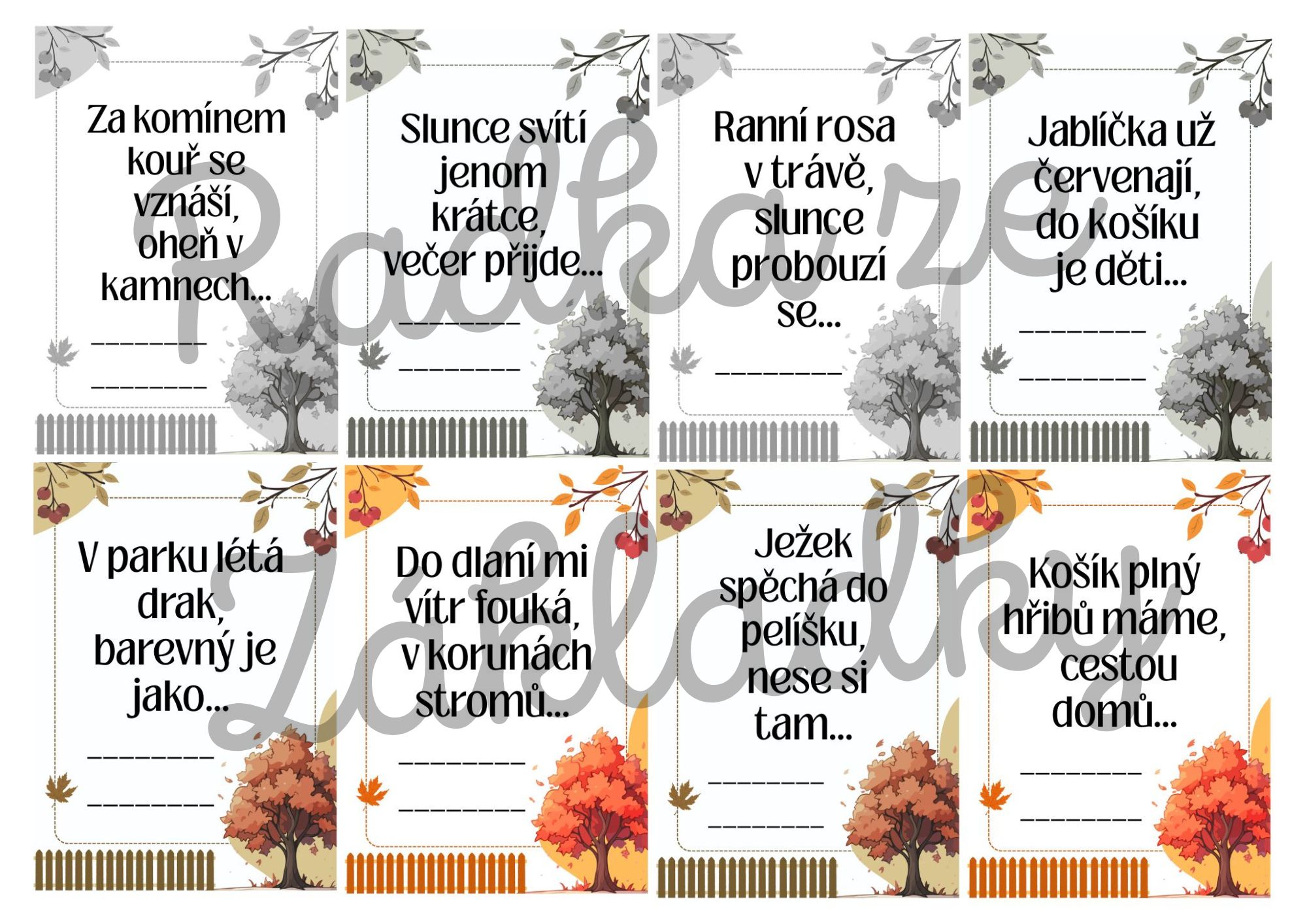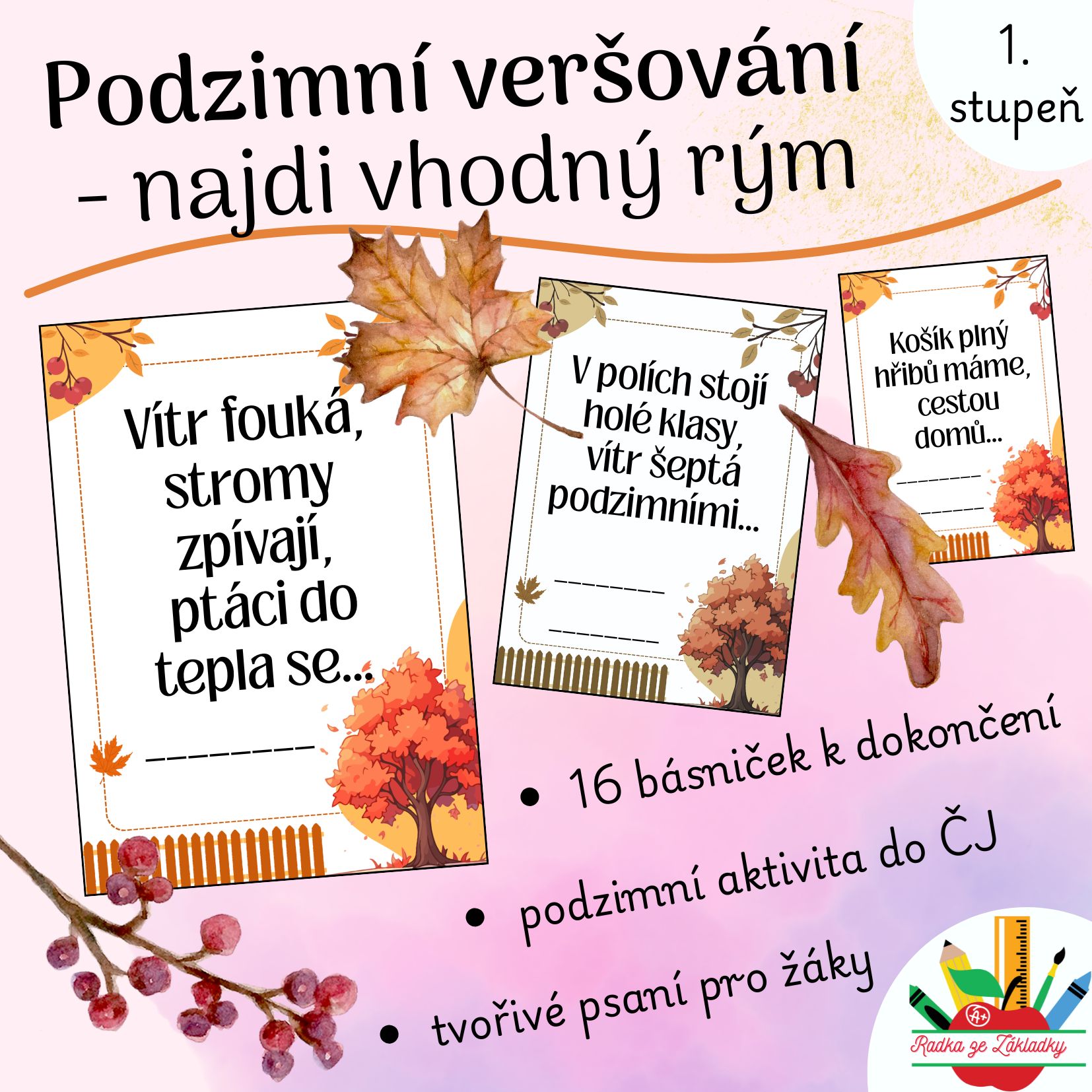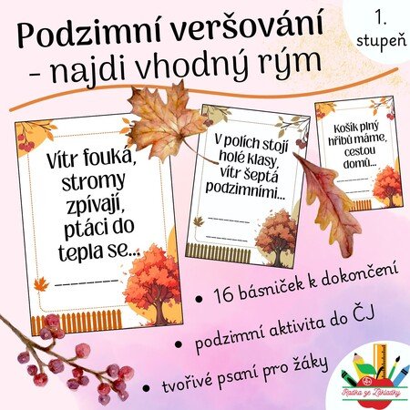 Tento hravý materiál přináší 16 nedokončených podzimních rýmovaček, které vybízejí žáky k tvořivému doplnění posledních slov či veršů.