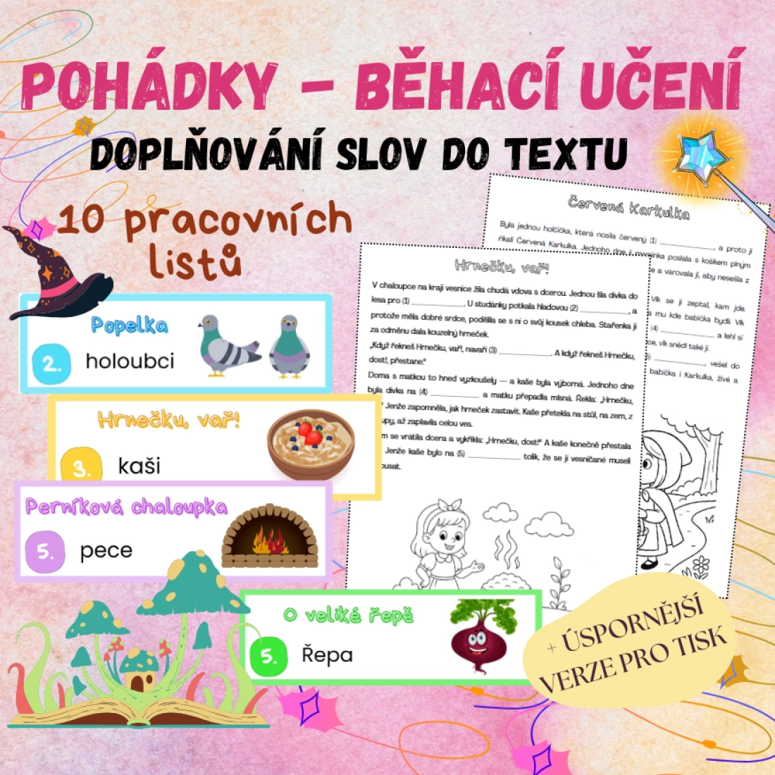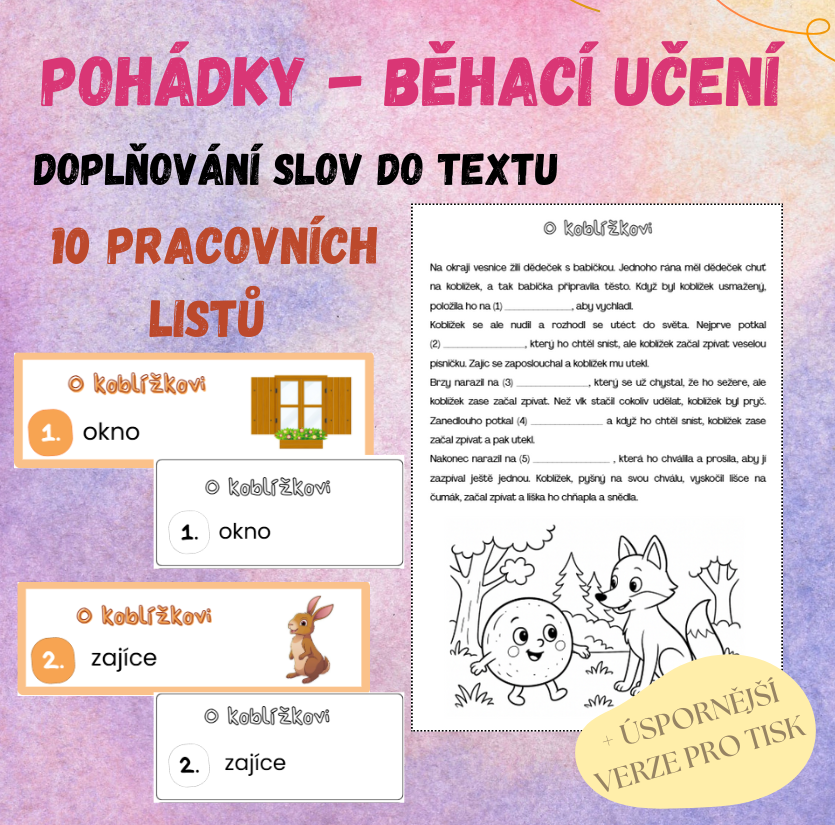 - Sadu 10 pracovních listů podle známých pohádek (např. Perníková chaloupka, Červená karkulka, Šípková Růženka…) s vynechanými slovíčky.