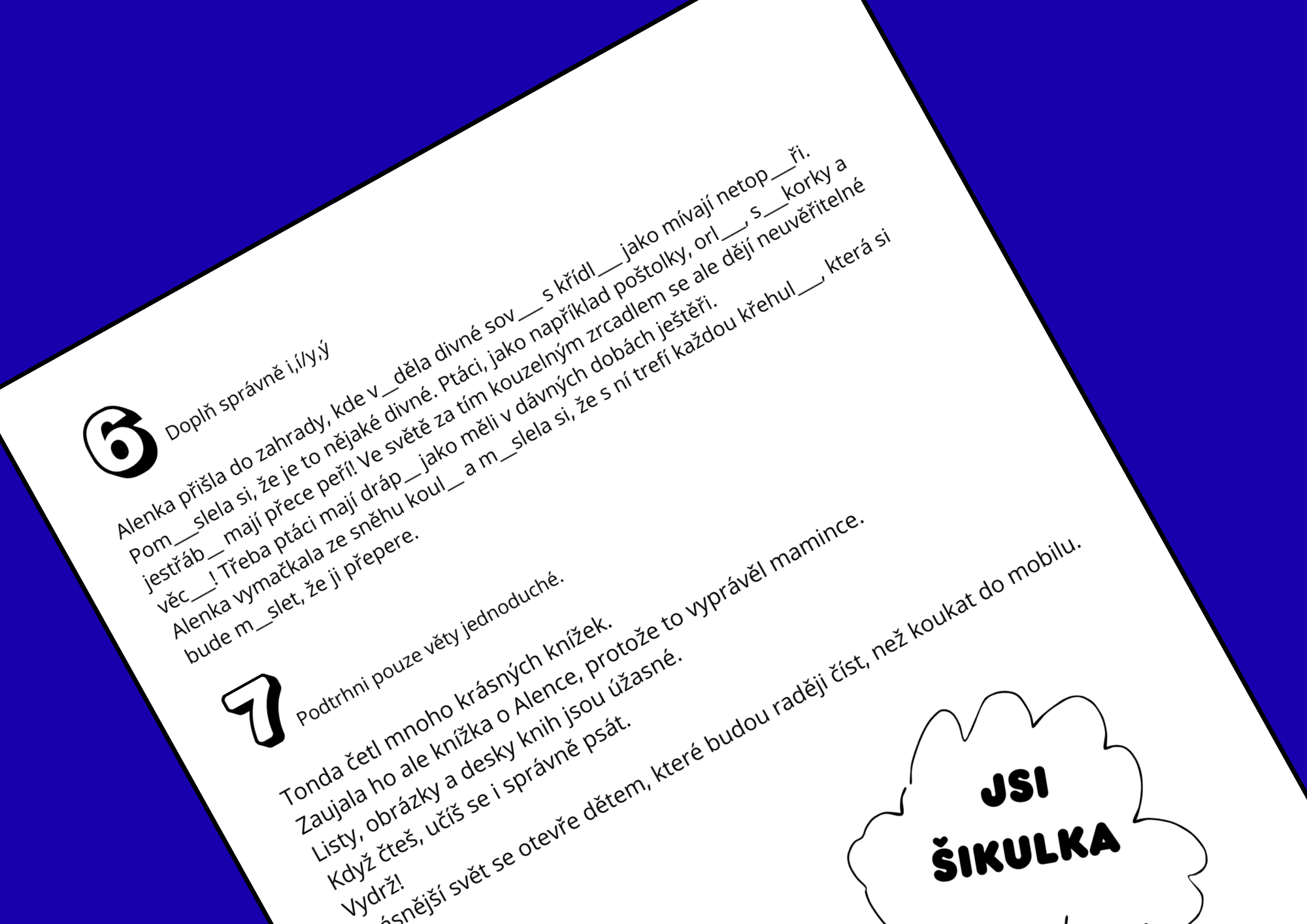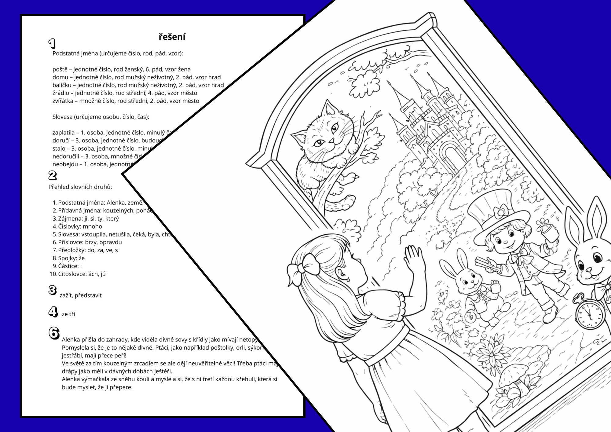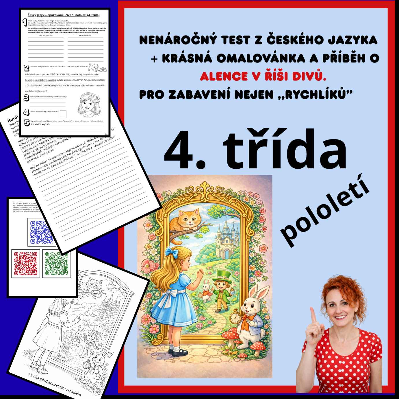 Líbí se mi nápad propojení s pohádkou o Alence v říši divů. Pracovní list navazuje krátkým autorským vyprávěním psaným dětským jazykem, které snad motivuje ke čtení, uvolnění po testu ... Děti si mají představit, co by viděly, kdyby prošly kouzelným zrcadlem. Tento nápad mohou rozvíjet výtvarně i jazykově. K dispozici mají tematickou omalovánku Alenky, prostor k dopsání vlastního příběhu nebo popisu říše, kterou si představí. Rychlíci si mohou vybrat z nabídky QR kódů, které nabádají k činnostem podle jejich tempa a zájmu.