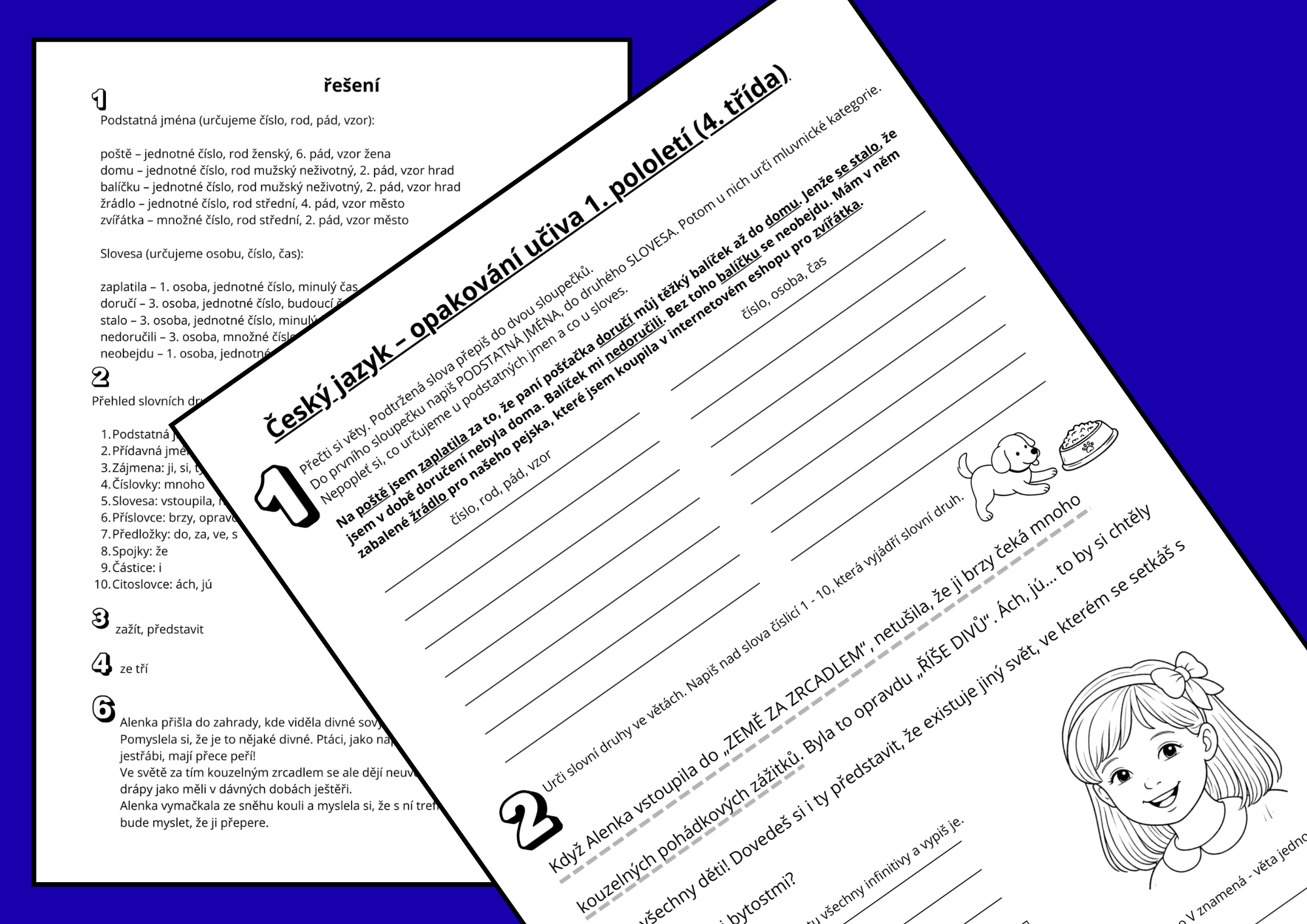 vytvořila jsem tento autorský pracovní list pro své žáky 4. třídy. Snažila jsem se pro děti připravit klidné, přehledné a nenáročné procvičení učiva českého jazyka za 1. pololetí. Děti si zopakují pravopis podstatných jmen, zaměří se na doplňování i/í a y/ý v koncovkách, určují mluvnické kategorie podstatných jmen a sloves, procvičí slovní druhy, infinitivy, rozpoznání vět jednoduchých v souvětí i vymyslet souvětí podle vzorce. Součástí je také úkol zaměřený na čtení s porozuměním a tvoření vlastních vět.