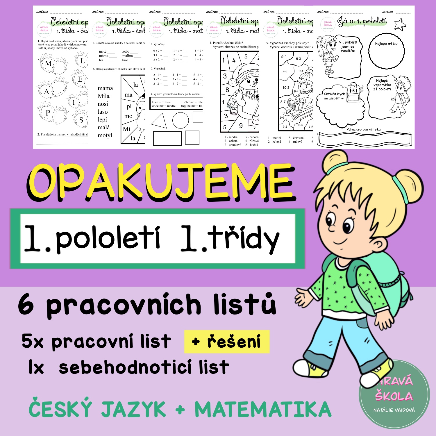 ✏️Materiál obsahuje 5 pracovních listů k zopakování učiva 1. pololetí českého jazyka a matematiky 1. třídy.