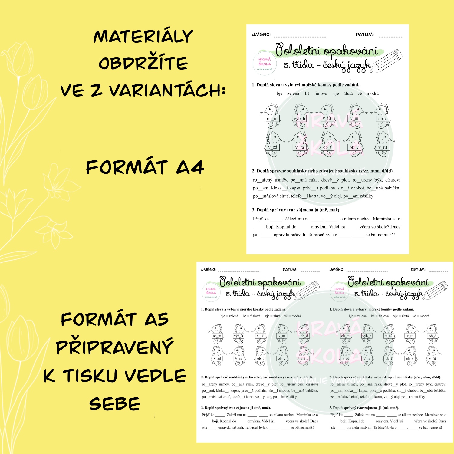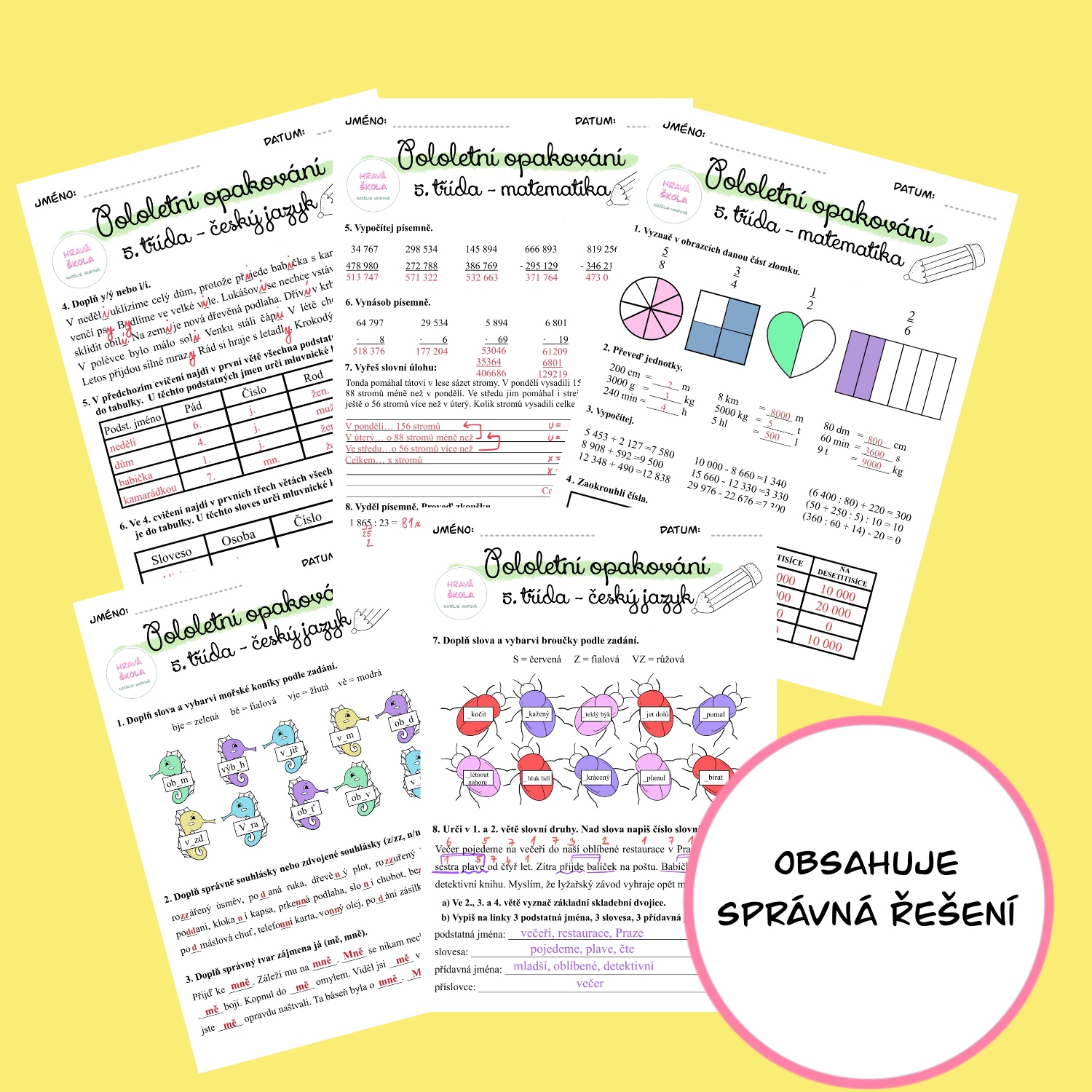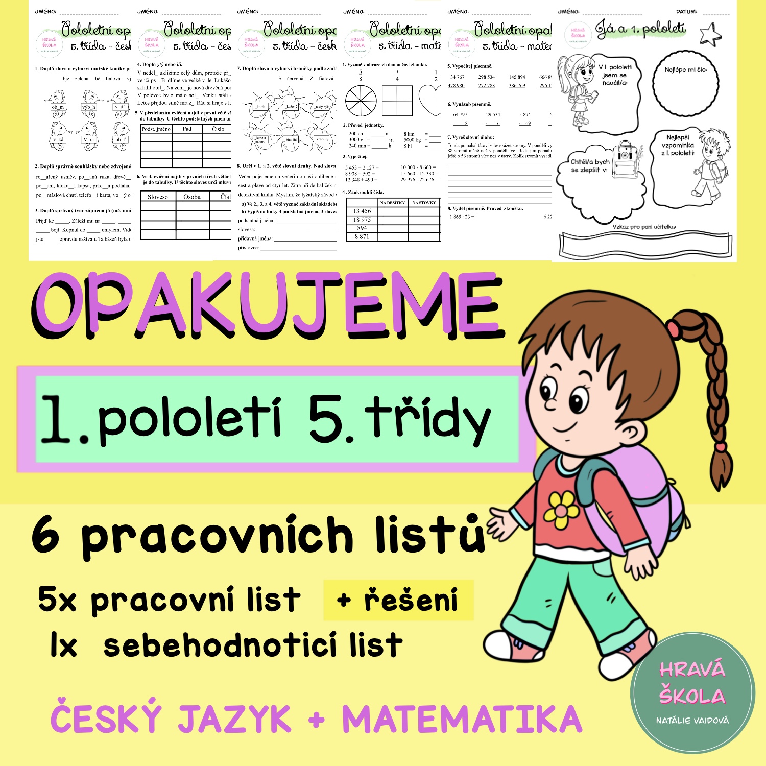 ✏️Materiál obsahuje 5 pracovních listů k zopakování učiva 1. pololetí českého jazyka a matematiky 5. třídy.