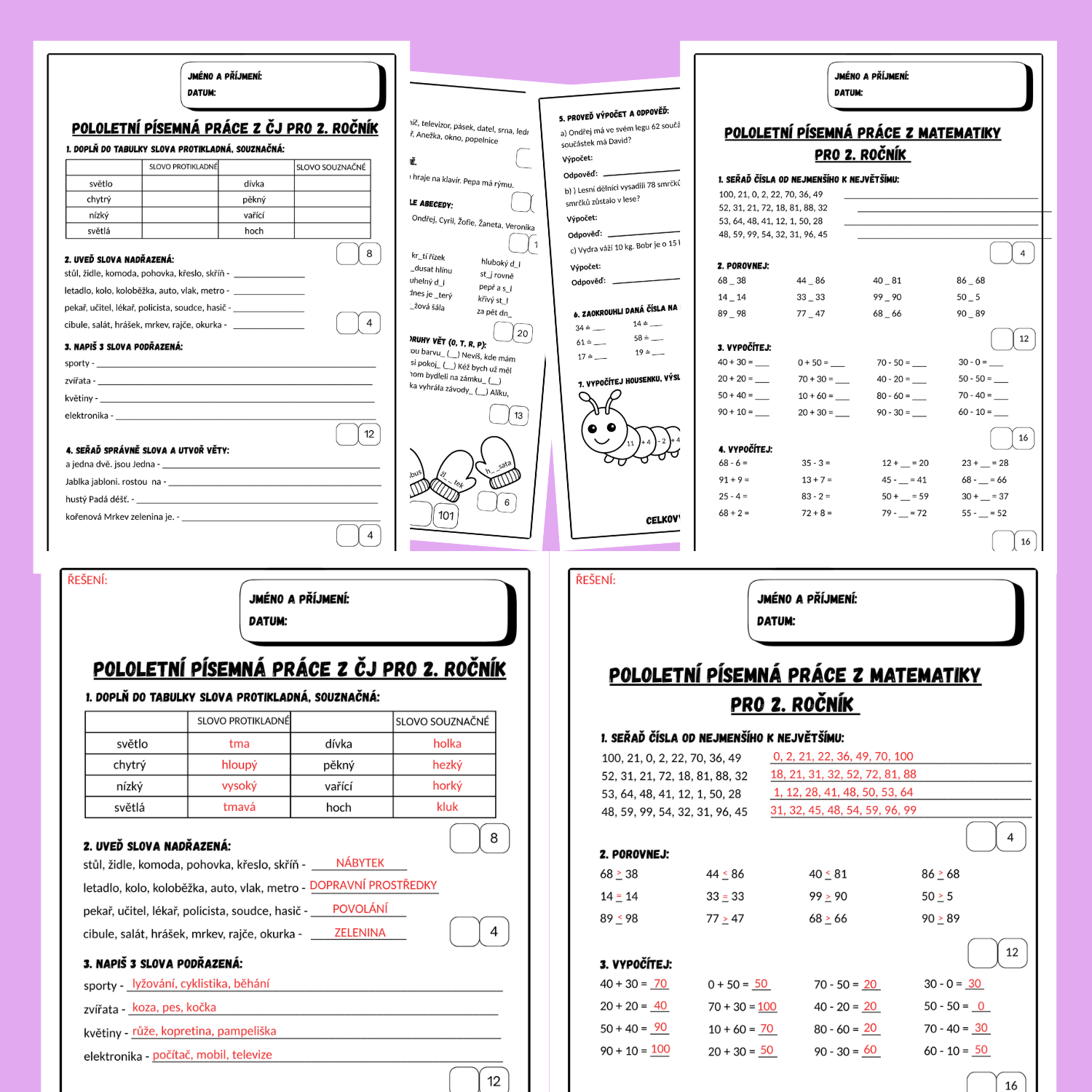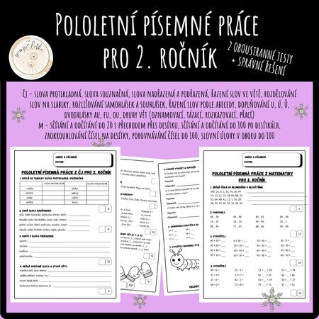 Tento materiál slouží jako komplexní pololetní písemné práce z českého jazyka a matematiky pro žáky 2. ročníku základní školy. Je určen k ověření znalostí a dovedností, které si žáci osvojili v průběhu 1. pololetí školního roku.