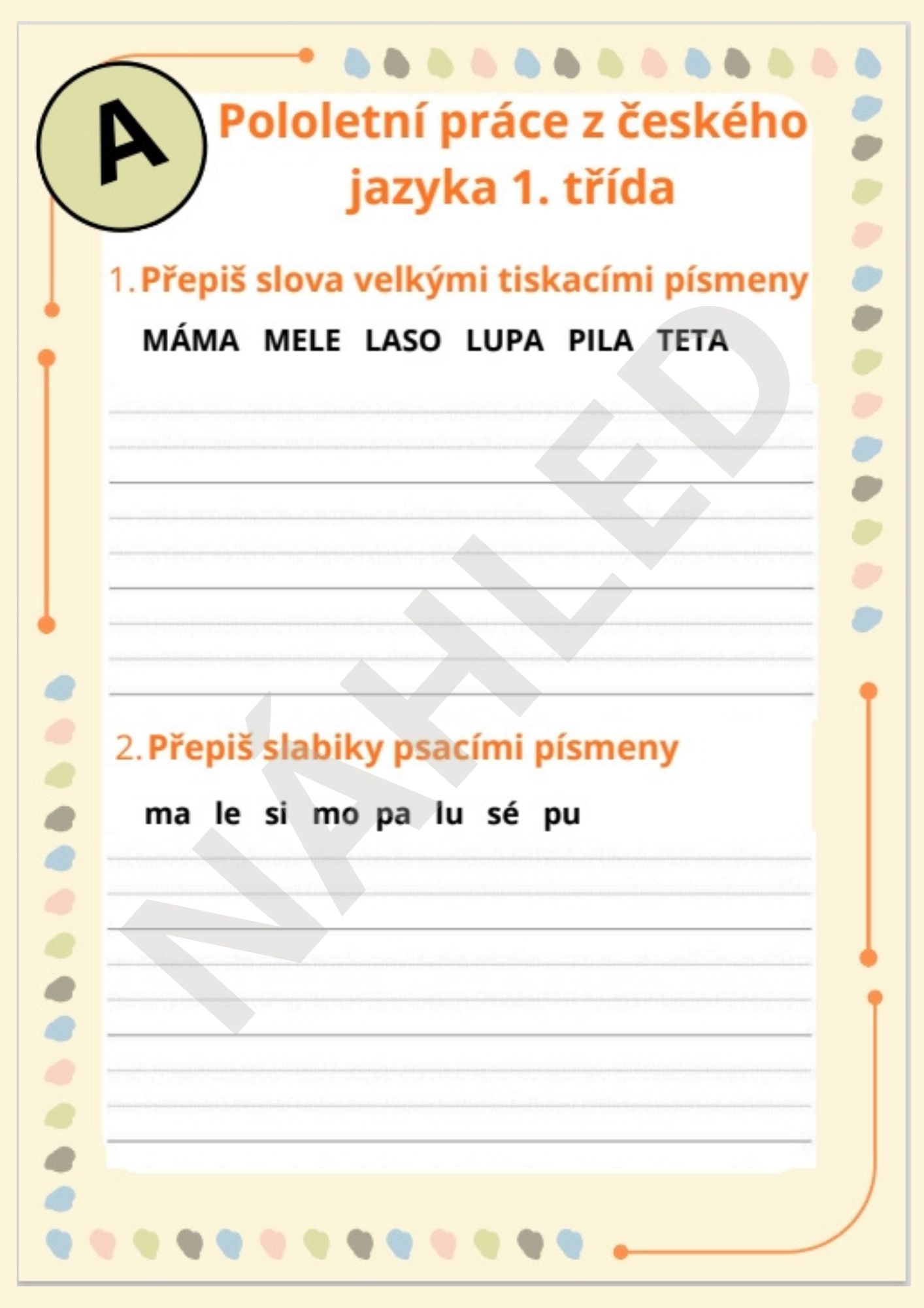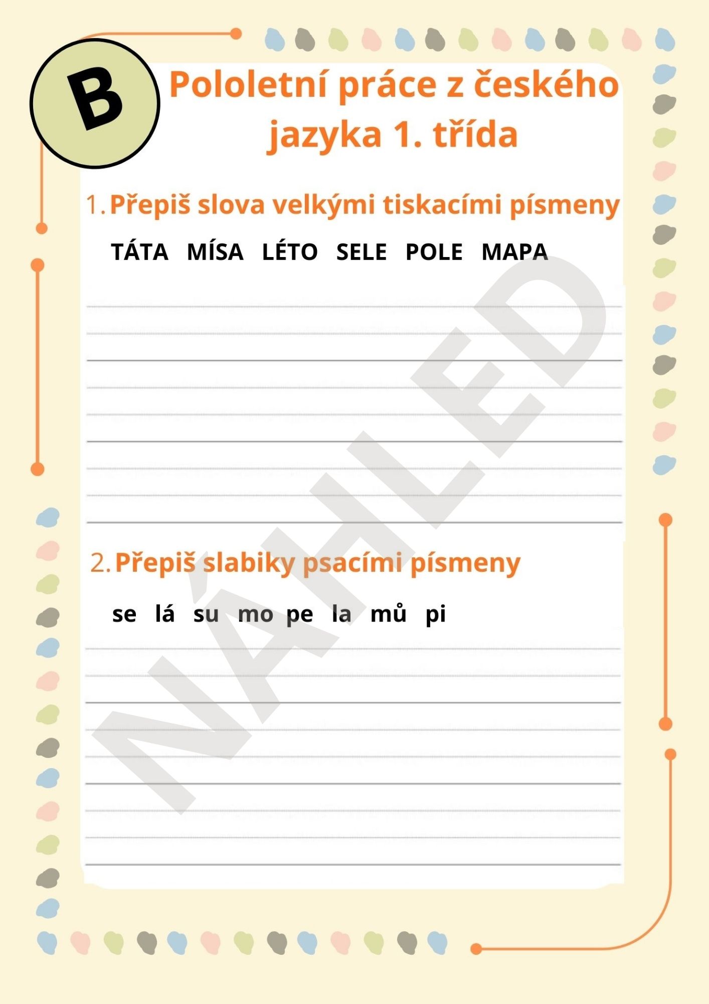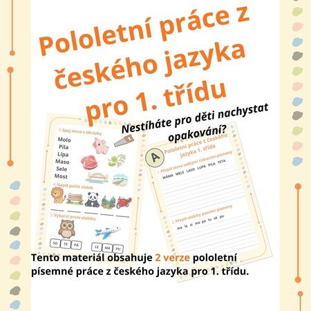 Tento materiál obsahuje pololetní písemnou práci z českého jazyka pro děti v 1. třídě. Materiál obsahuje 2 verze testíku.