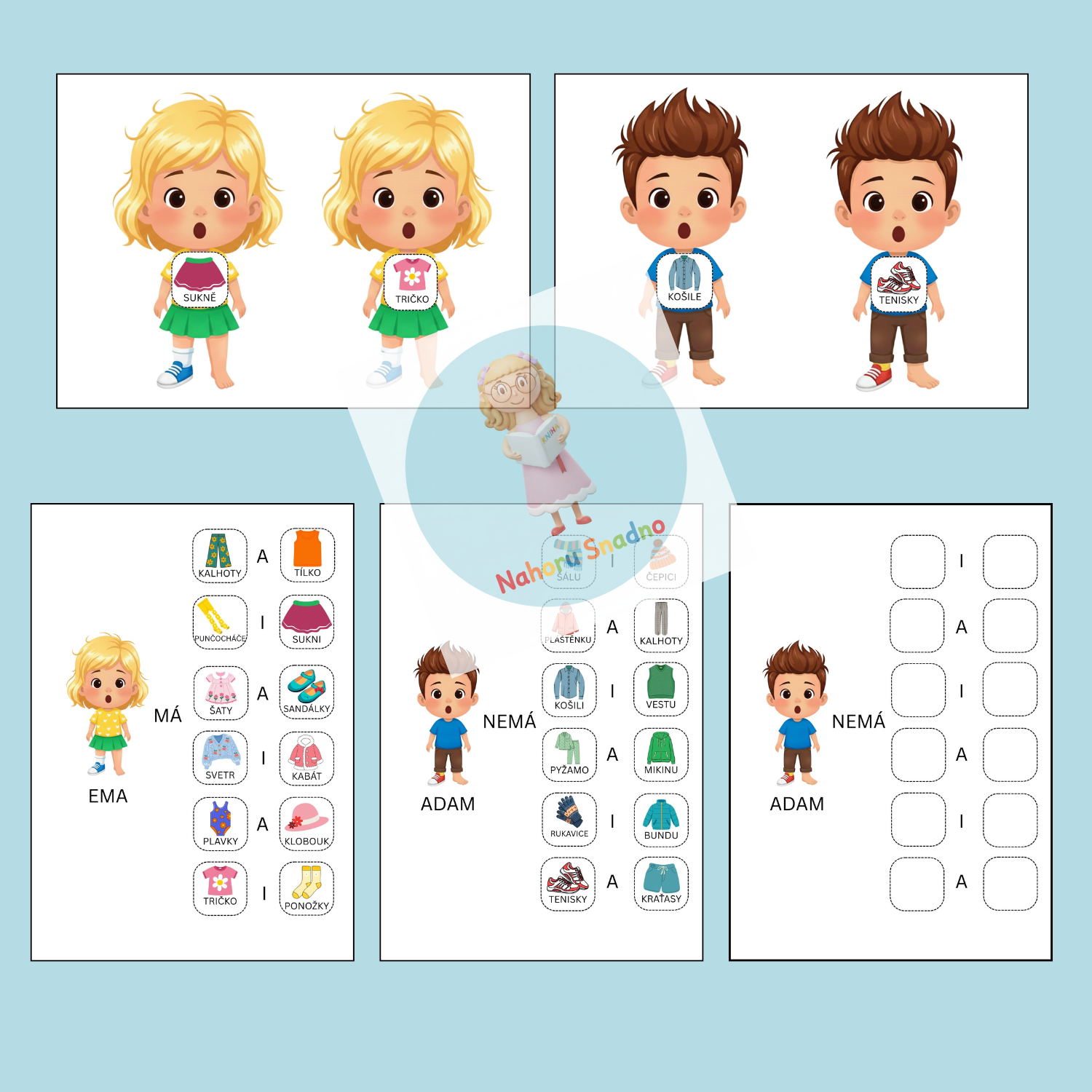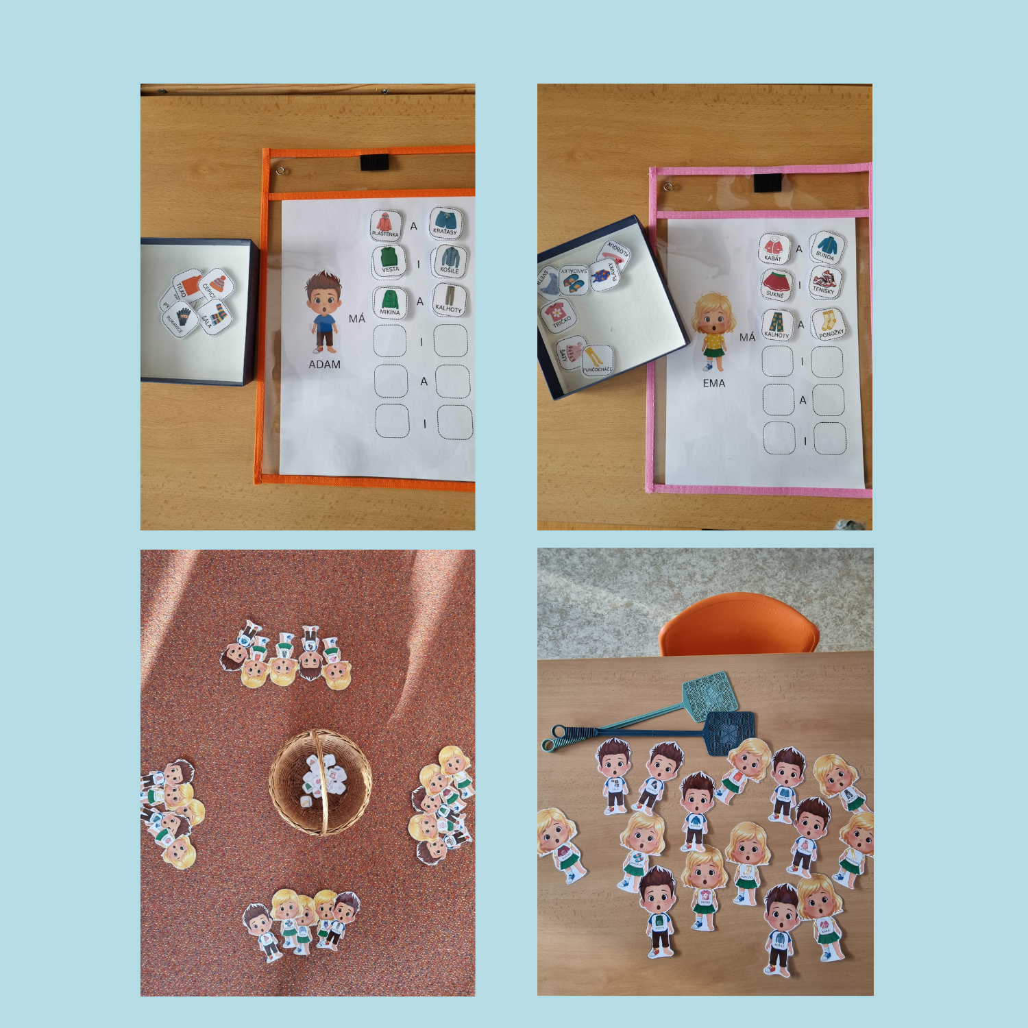 připravila jsem pro vás soubor Popletený Adam a neobutá Ema, který vznikl s jediným cílem – přinést dětem radost z objevování slovní zásoby na téma oblečení a zároveň usnadnit vám přípravu zábavných, přehledných a smysluplných aktivit. Soubor je vhodný do MŠ i pro děti se speciálními vzdělávacími potřebami – díky své názornosti, jednoduchosti a variabilnímu použití.