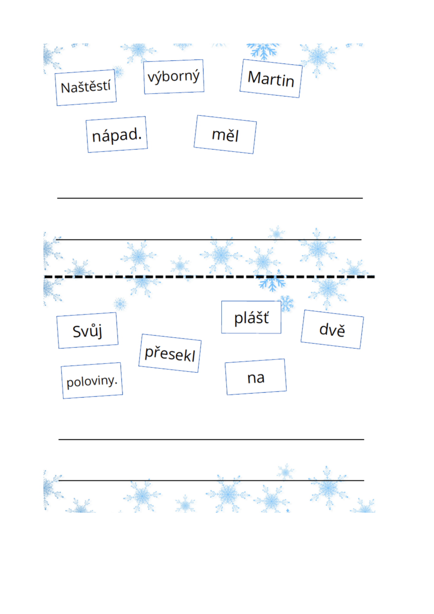 Každou větu pak žáci mohou přepsat na linky, které se nachází pod každými rozházenými slovy.