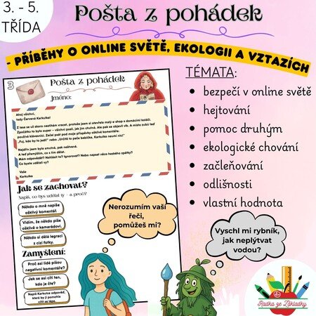 Pohádkové postavy v dopisech prožívají moderní problémy, které řeší i dnešní děti – online svět, nevhodné komentáře, ekologii, respekt k odlišnostem či hledání vlastních hodnot.
