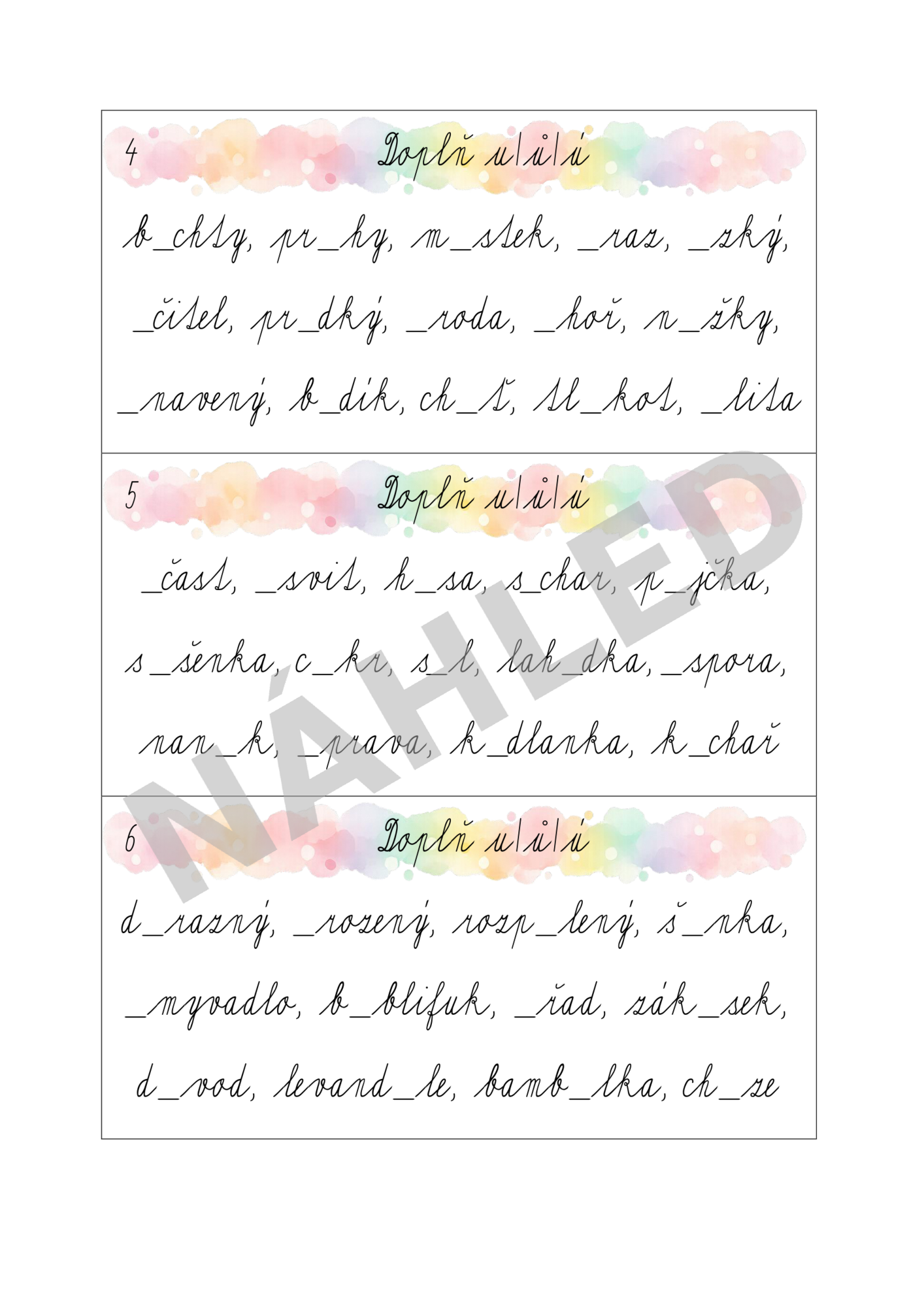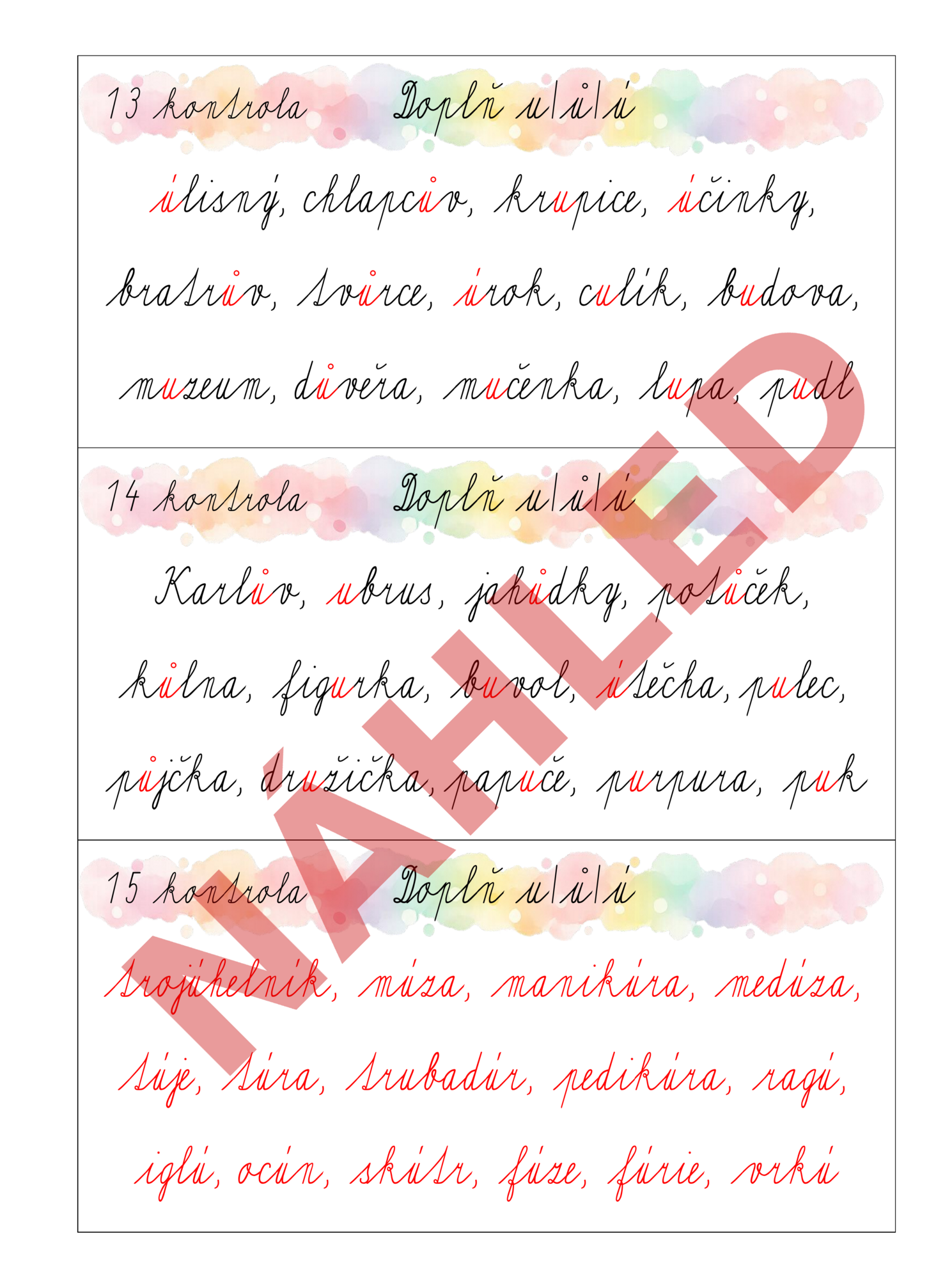 Procvičování psaní u/ú/ů přehledně a systematicky.