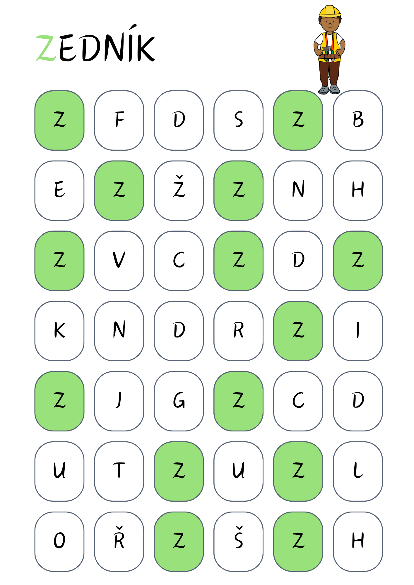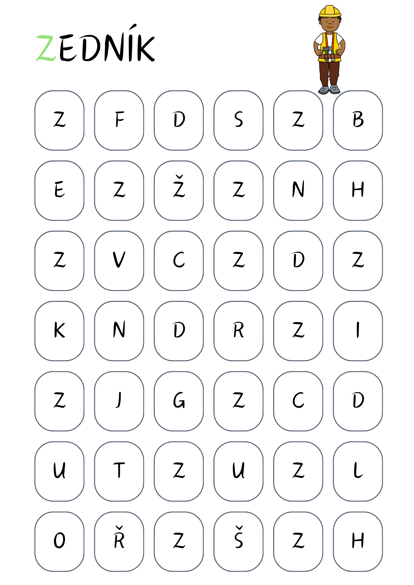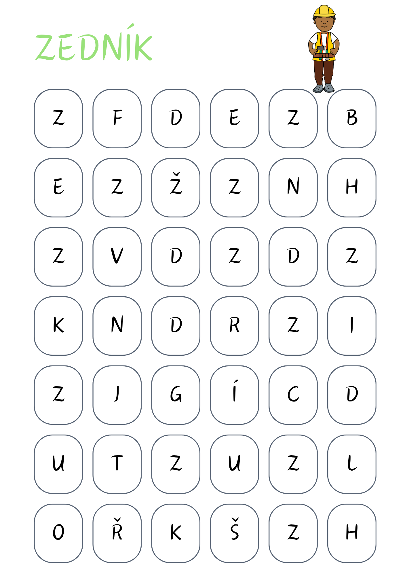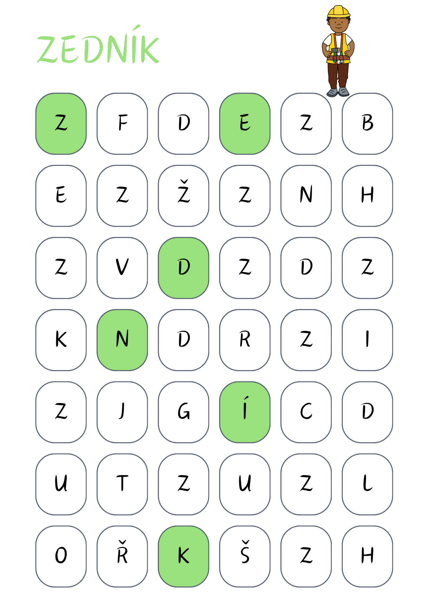 Děti skládají, přepisují a hledají názvy povolání, určují první i poslední písmeno, slabikují a trénují čtení i pozornost.