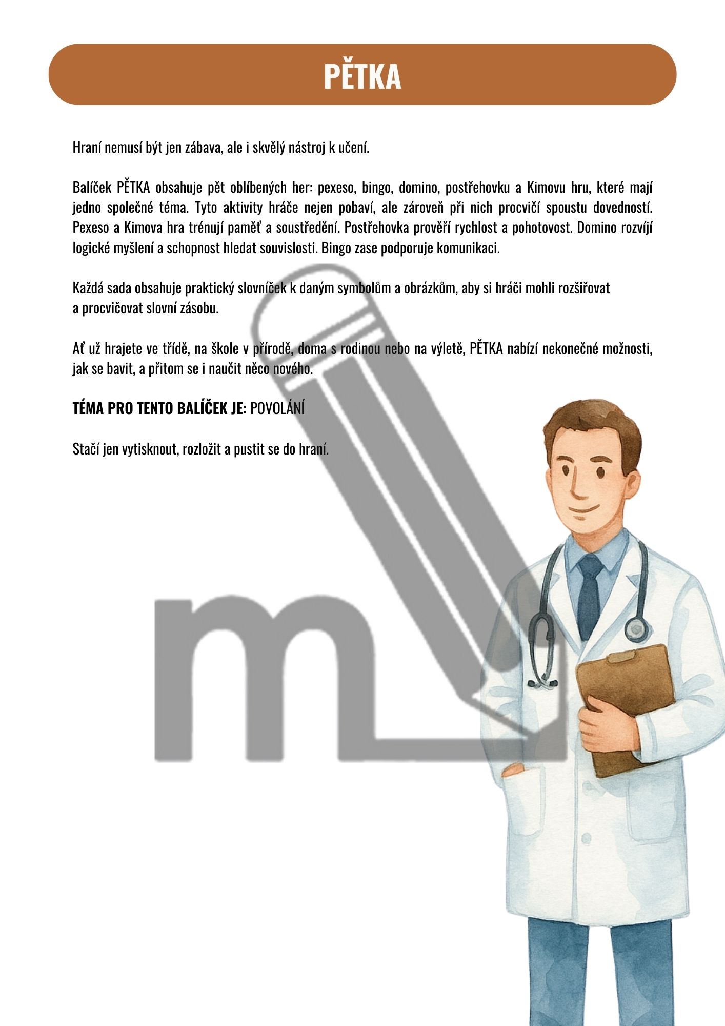 Balíček PĚTKA obsahuje pět oblíbených her: pexeso, bingo, domino, postřehovku a Kimovu hru, které mají jedno společné téma. Tyto aktivity hráče nejen pobaví, ale zároveň při nich procvičí spoustu dovedností a znalostí.