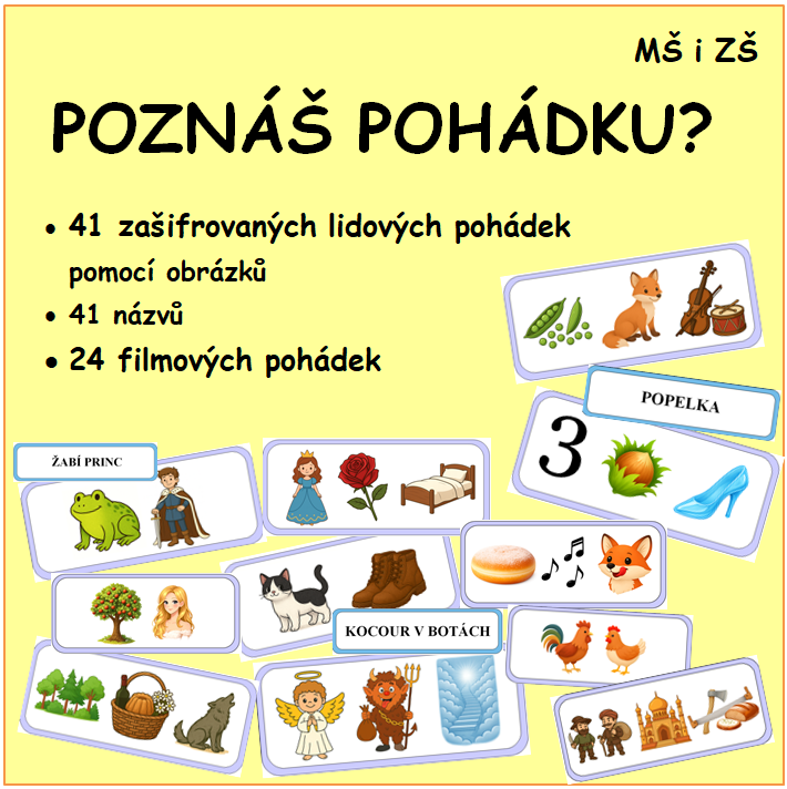 Materiál je věnovaný pohádkám, lze jej využít s dětmi předškolního i školního věku v hodinách literární výchovy. Celkem obsahuje 41 zašifrovaných lidových pohádek, které by žáci podle obrázků měli poznat + názvy jednotlivých pohádek. A 24 zašifrovaných filmových pohádek bez názvu, kde žáci hádají a pátrají po názvu pohádky a srovnávají indicie s filmovou verzí.