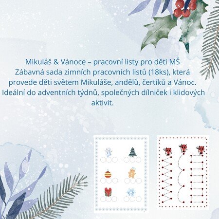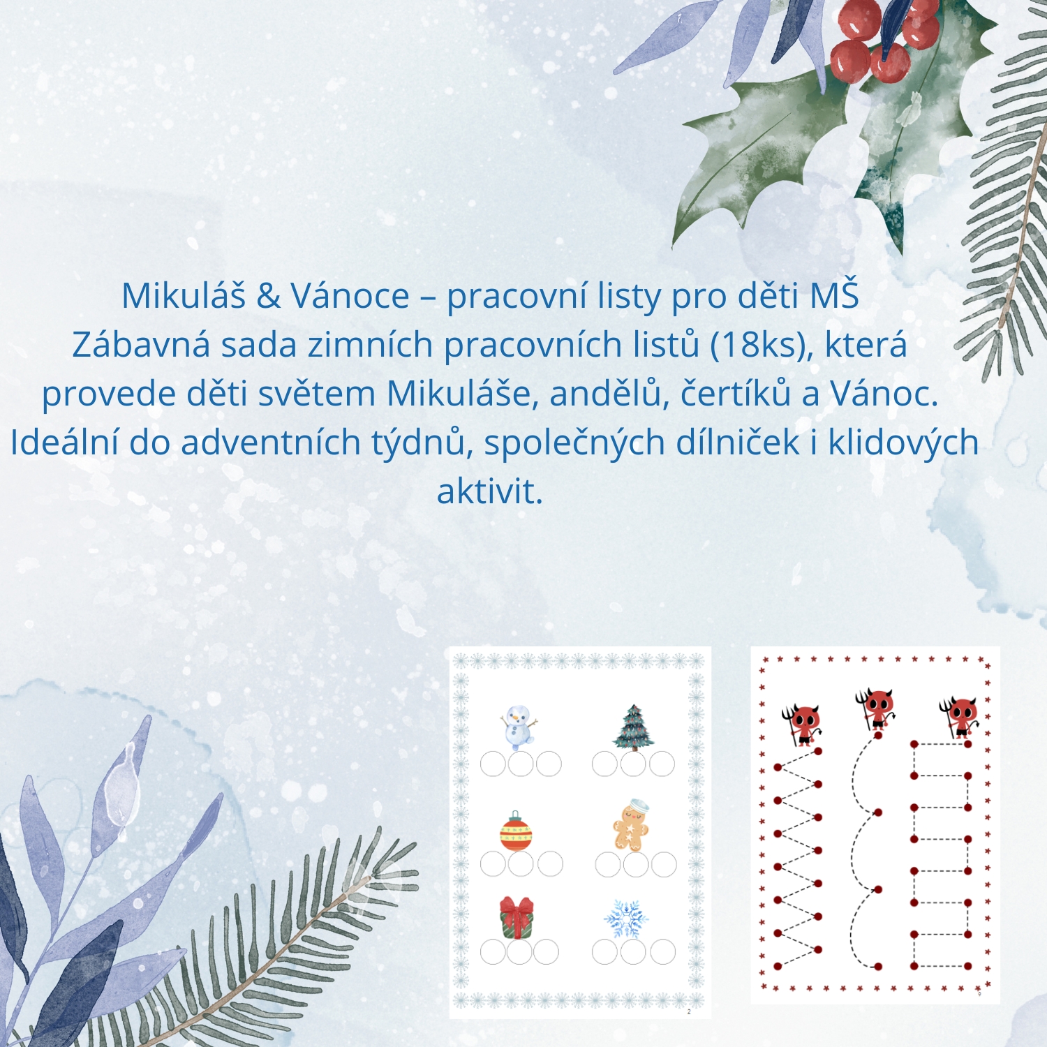 Zábavná sada zimních pracovních listů, která provede děti světem Mikuláše, andělů, čertíků a Vánoc.