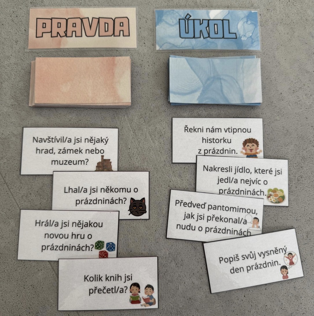 - Můžeme hru hrát v kruhu a nebo chodit před tabuli, každý si vybere pravdu nebo úkol - kdo splní, bere si kartu k sobě.