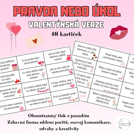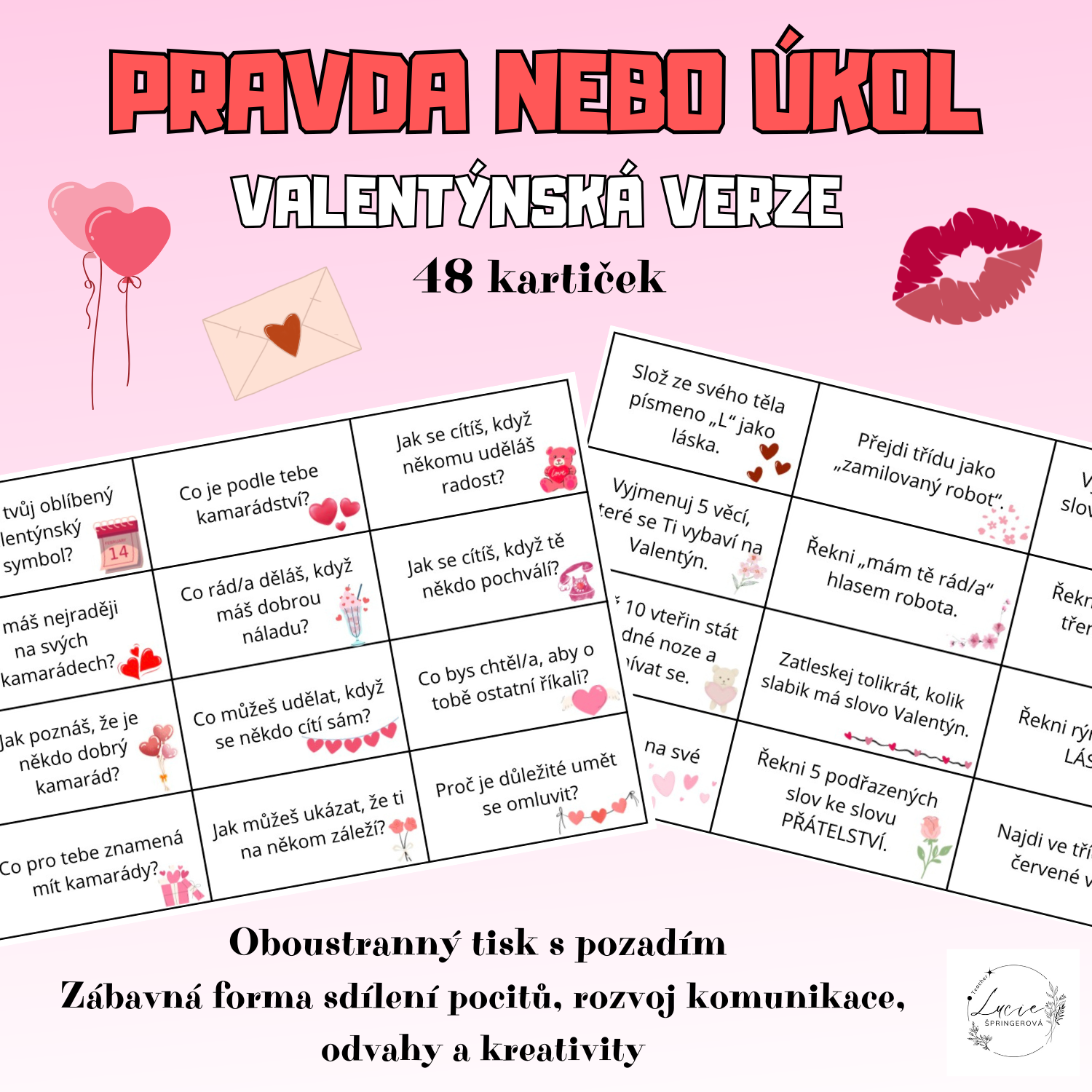 Soubor obsahuje 48 kartiček - 24 kartiček s otázkou na pravdivou odpověď a 24 kartiček s úkolem.