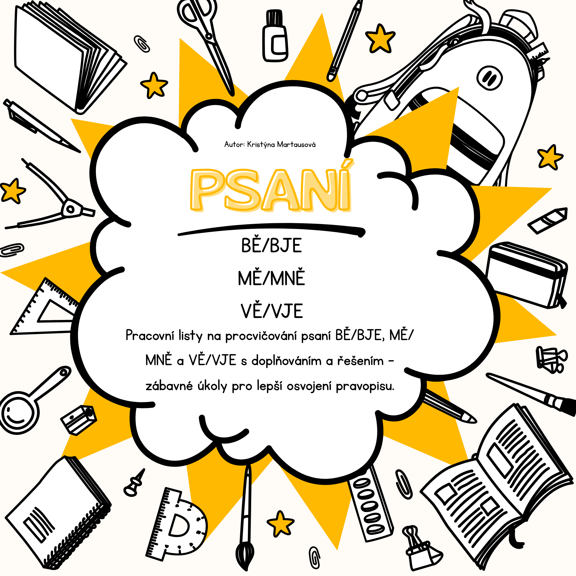 Tento materiál obsahuje soubor pracovních listů zaměřených na procvičování psaní často zaměňovaných hlásek BĚ/BJE, MĚ/MNĚ a VĚ/VJE. Najdete zde různé typy úkolů – doplňování do vět, cvičení na rozlišení pravopisu a zábavné úkoly, které dětem pomohou osvojit si správné psaní.