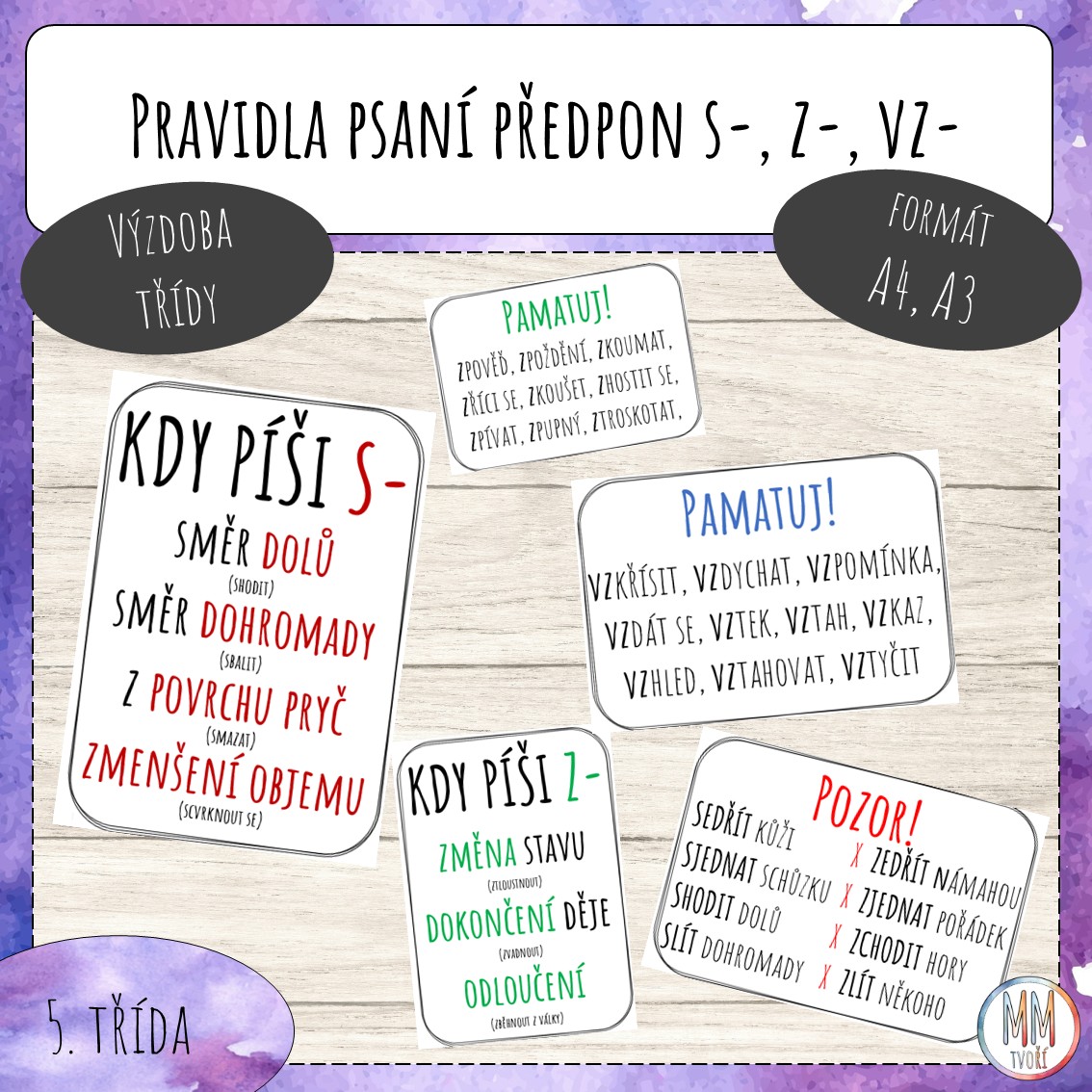 Materiál obsahuje pravidla pro psaní předpon s-, z-, vz-, slova. ve kterých se nejčastěji chybuje a problémové dvojice. Vše je ve formátu A3 a A4.