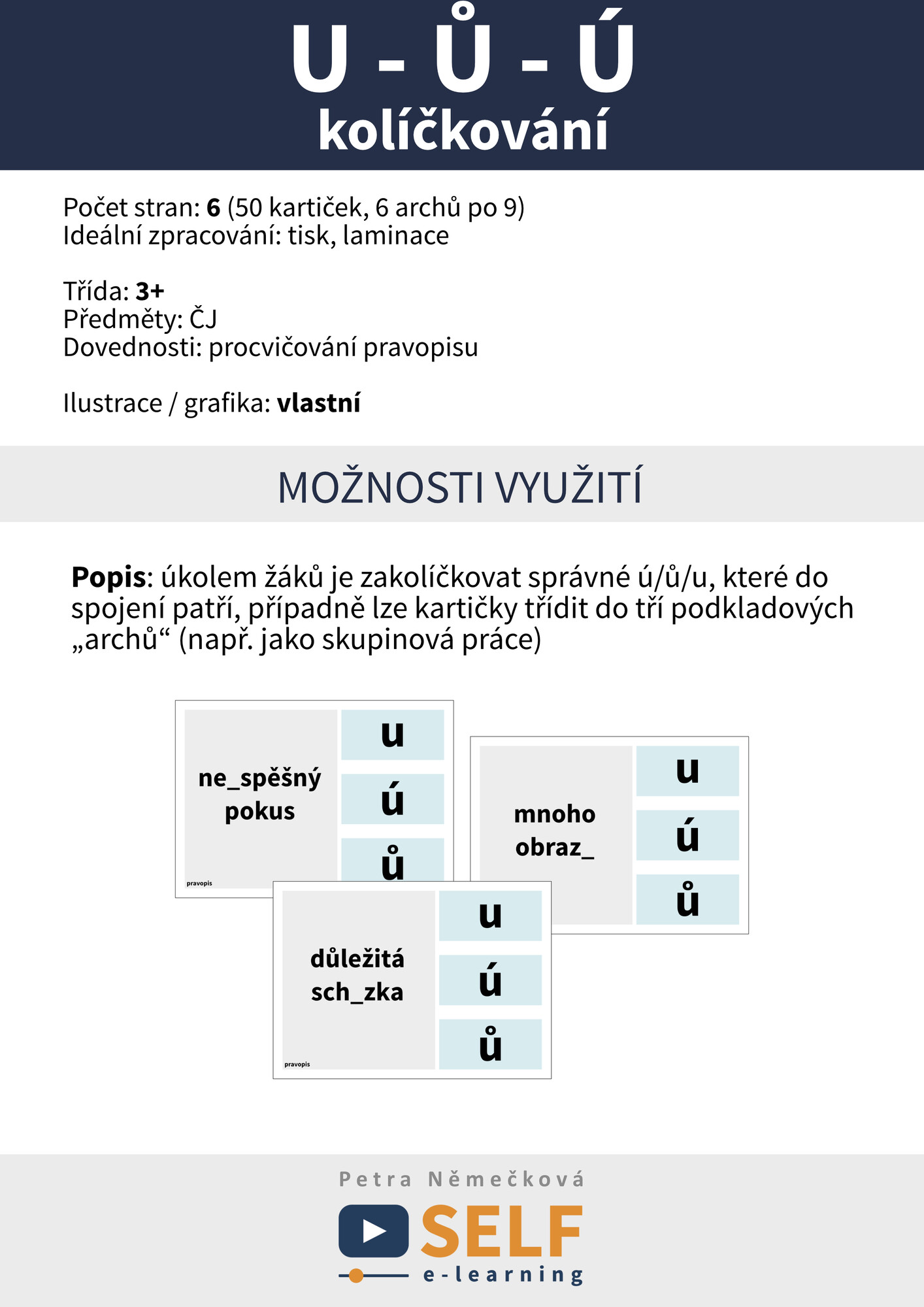Popis: úkolem žáků je zakolíčkovat správné ú/ů/u, které do spojení patří, případně lze kartičky třídit do tří podkladových „archů“ (např. jako skupinová práce)