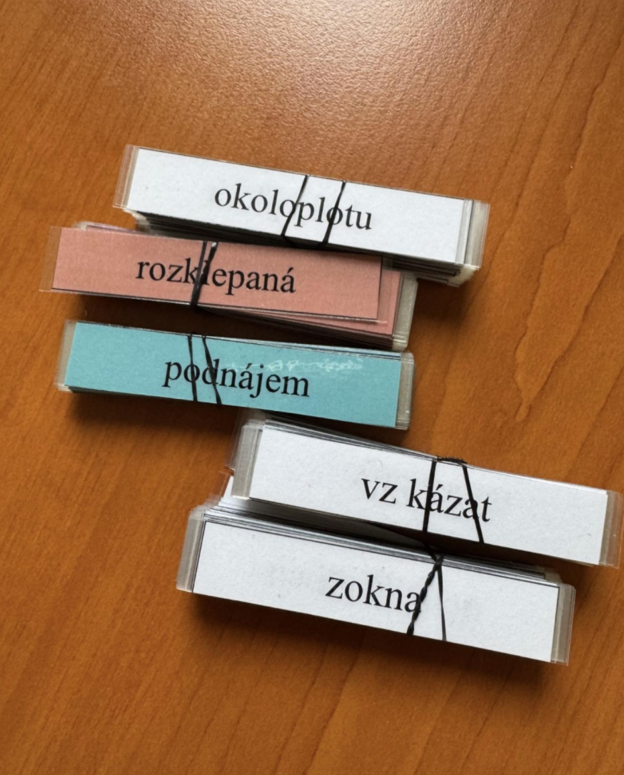 Při oboustranném tisku po rozstříhání na jedné kartičce najdeme například slovo s maminkou, na druhé straně je smaminkou, žák musí rozhodnout, na jaké straně je slovo napsané správně.