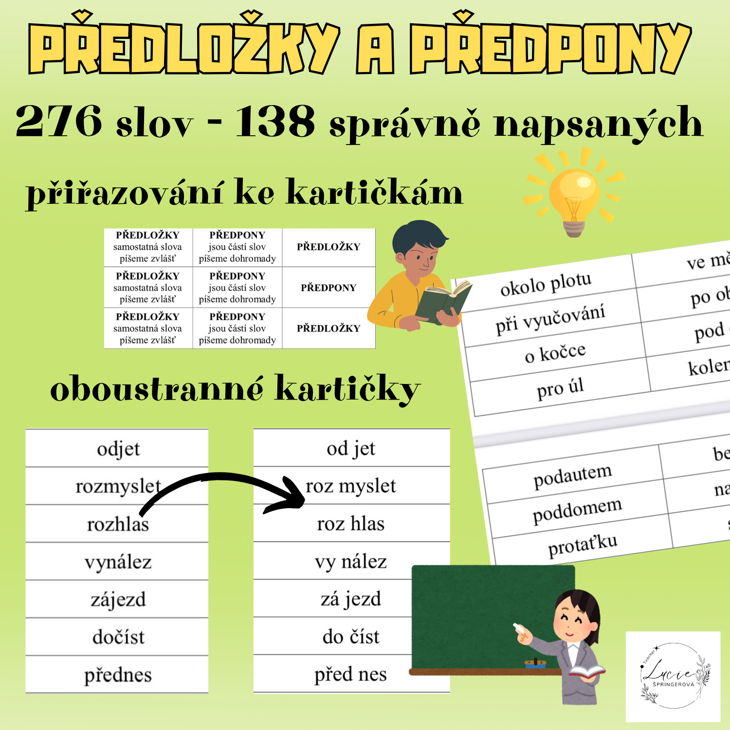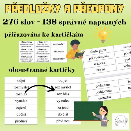 Kartičky s nápovědou, co jsou předložky a předpony, pro bystřejší žáky rozdáme pouze kartičky předložky a předpony.