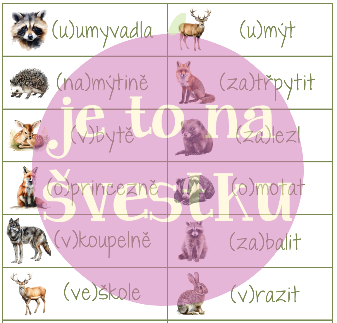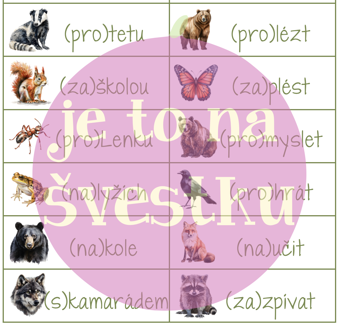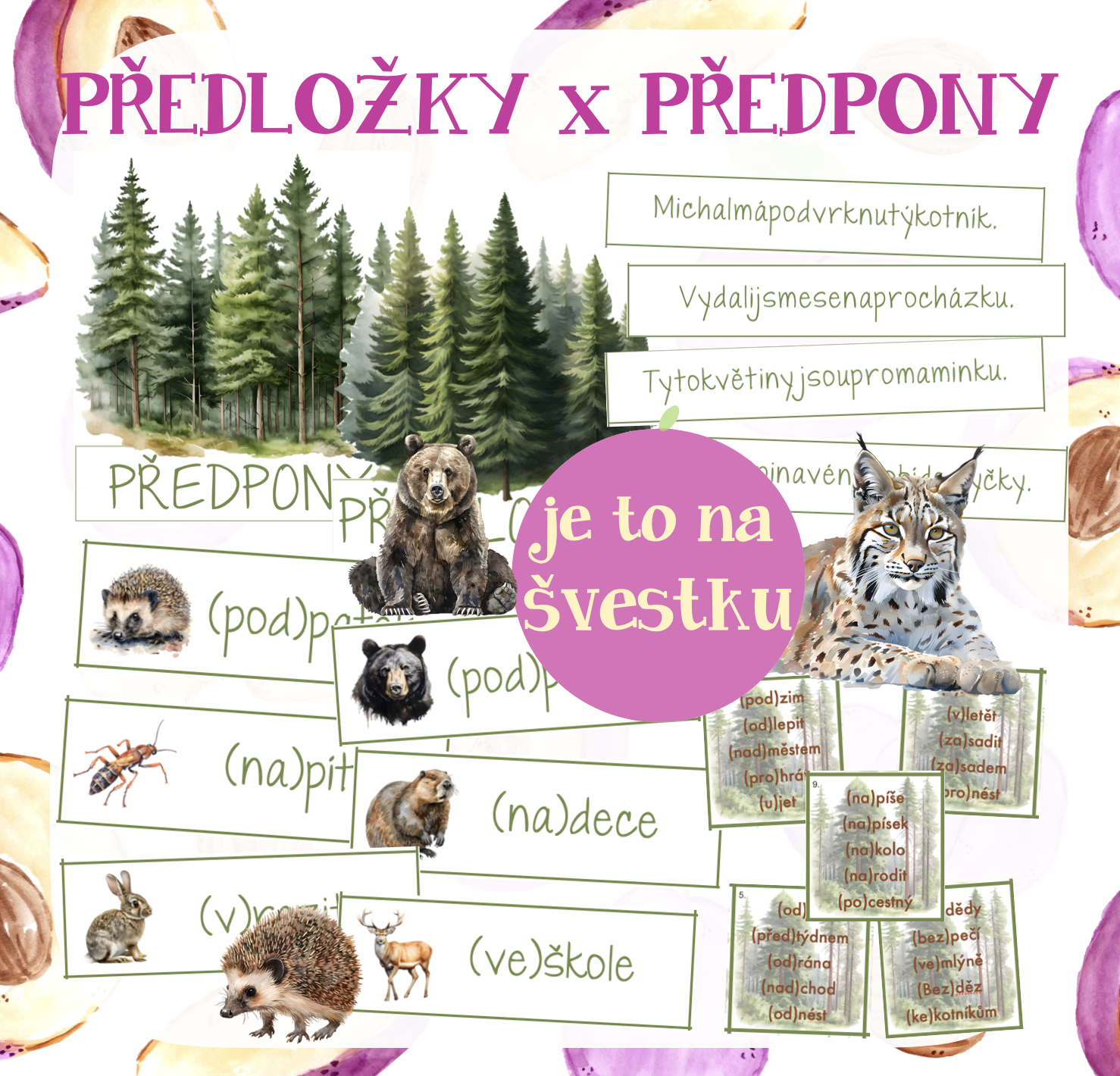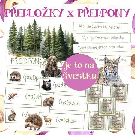 Materiál obsahuje 90 slov, která se přiřazují buď k předložkám a nebo předponám. Dále pak 27 vět vhodných k rozdělení slov a k přepisu. Na závěr je tu 12 kartiček vždy s pěti slovy k přepisu a k vymýšlení vět.