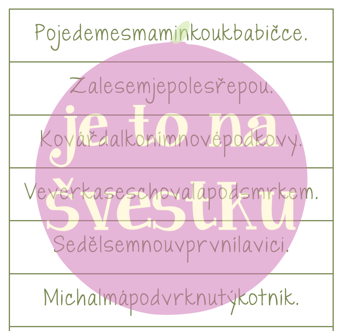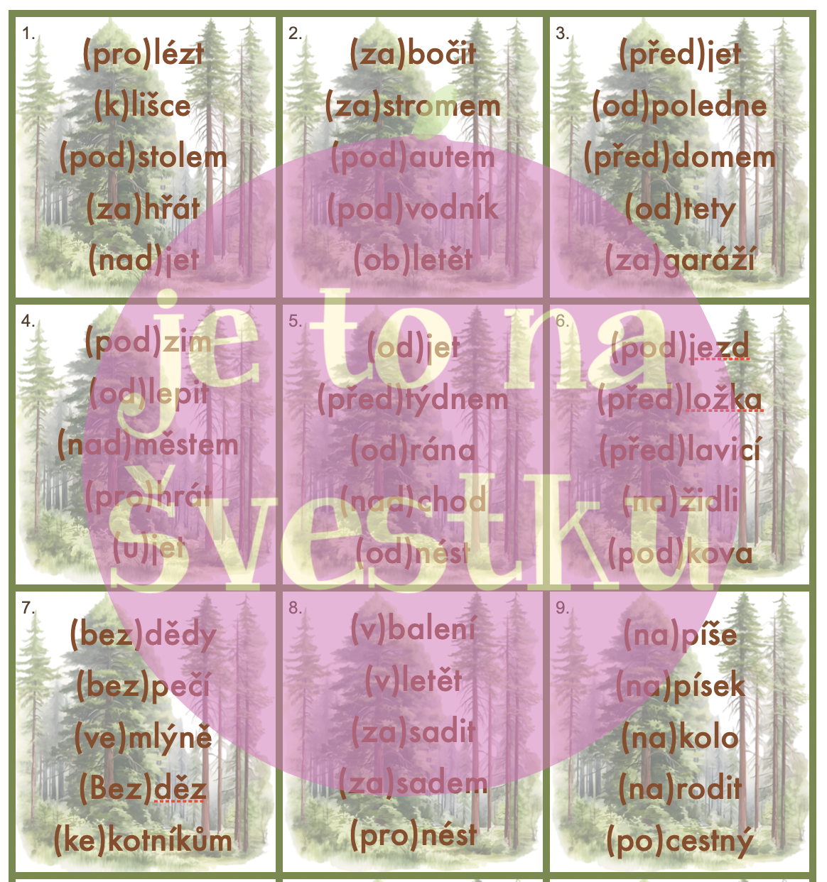 Dvě velké karty PŘEDPONY a PŘEDLOŽKY slouží jako podklad k přiřazování 90 slov. Dále jsou zde věty, ve kterých chybí mezery. Úkolem žáků je větu správně rozdělit na slova a poté ji přepsat. Poslední kartičky jsou určené také ke správnému psaní slov.